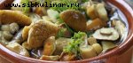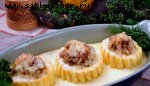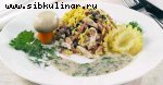 Картофелины, Белые грибы, Луковица, Яйцо, Сметана, Мука, Жир, Соль, перец, Зелень