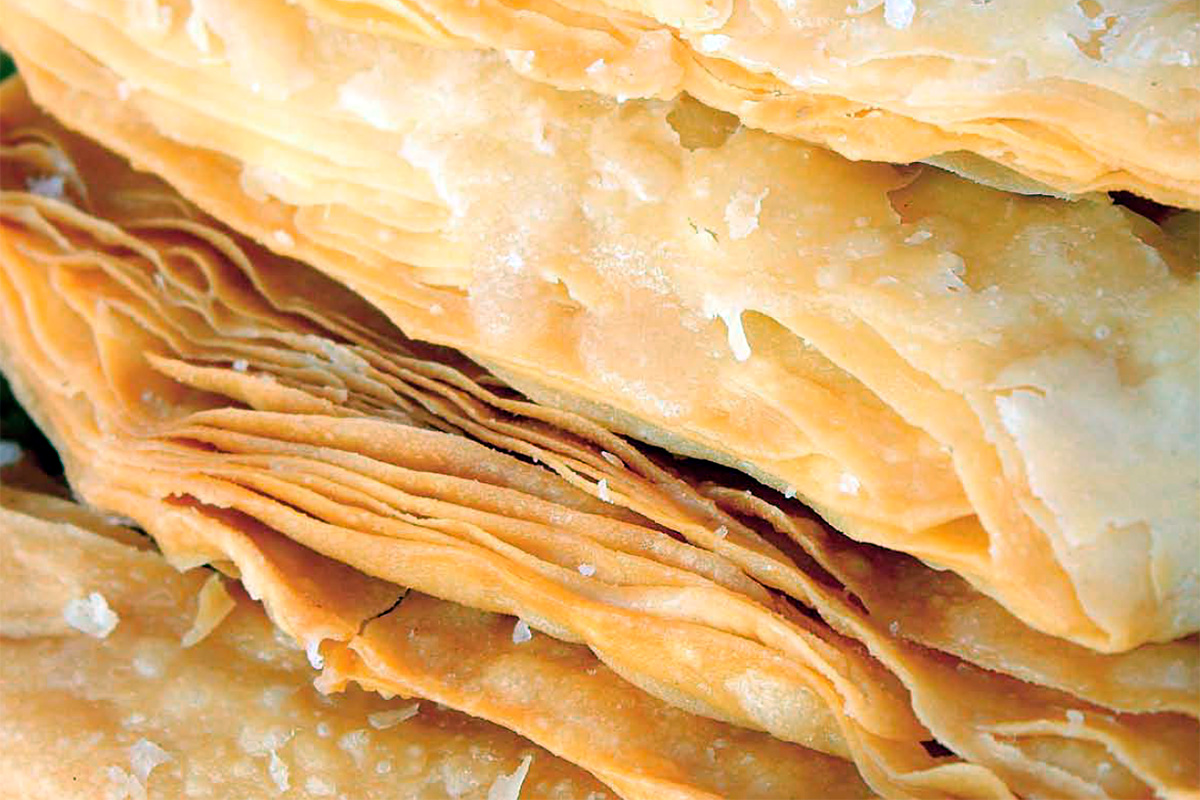 1. Тесто должно быть средним, чуть мягче, чем на лагман или манты. Уберем его в пакет, чтобы отлежалось. Спустя 30-40 минут раскатываем в тонкий пласт. Смазываем его сливочным маслом, но не очень обильно, так как нам еще предстоит жарить его все на том же сливочном масле. В идеале лучше взять топленое масло, но если его нет, то обычное сливочное тоже подойдет.