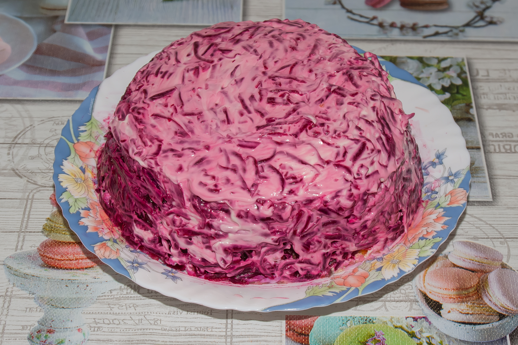 Во-вторых выкладывать на блюдо слоями: картофель, сельдь, лук, свекла, — чередуя их, пока не закончатся продукты, и смазывая каждый слой тонким слоем майонеза.