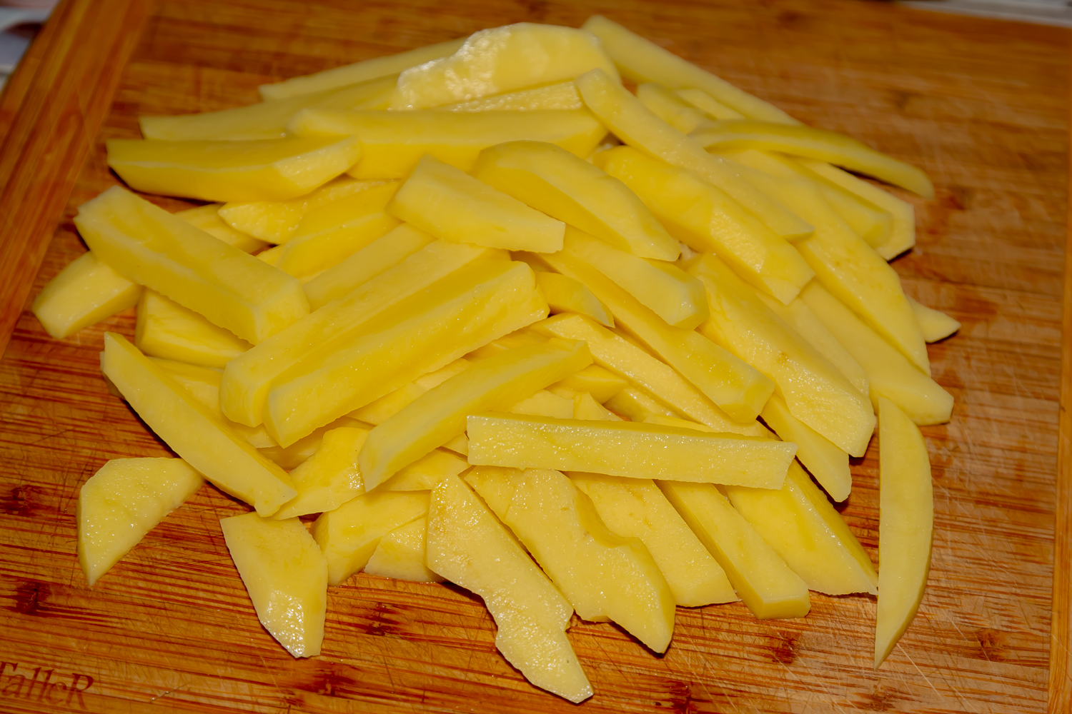 Картофель очищаем от кожуры и тщательно промываем под холодной водой. Аккуратно нарезаем овощ тонкими равными полосками.