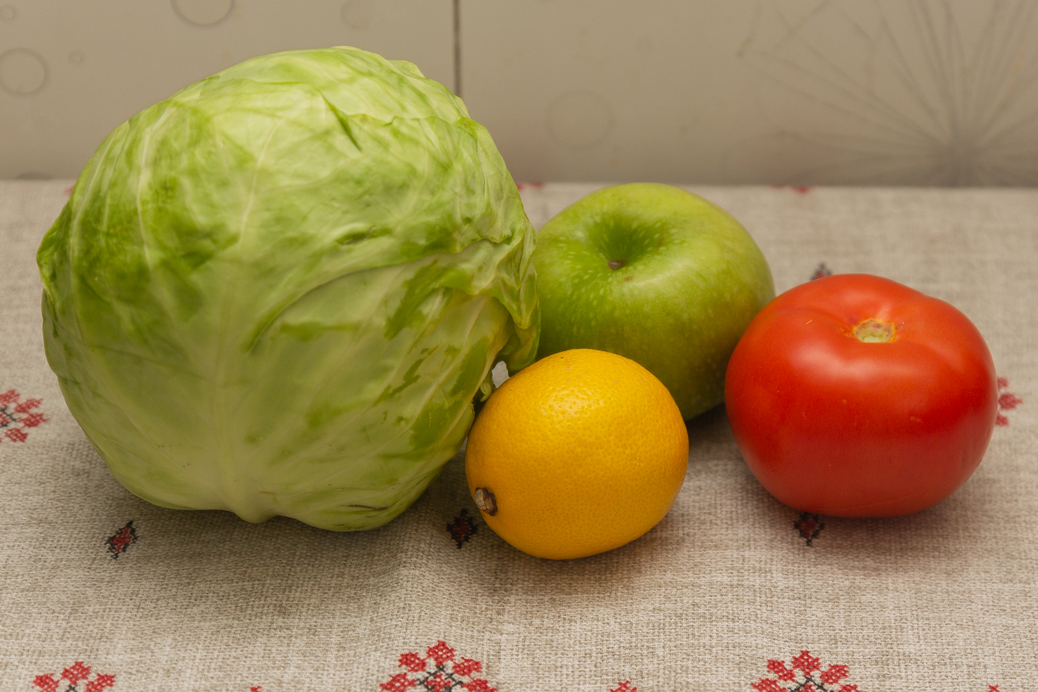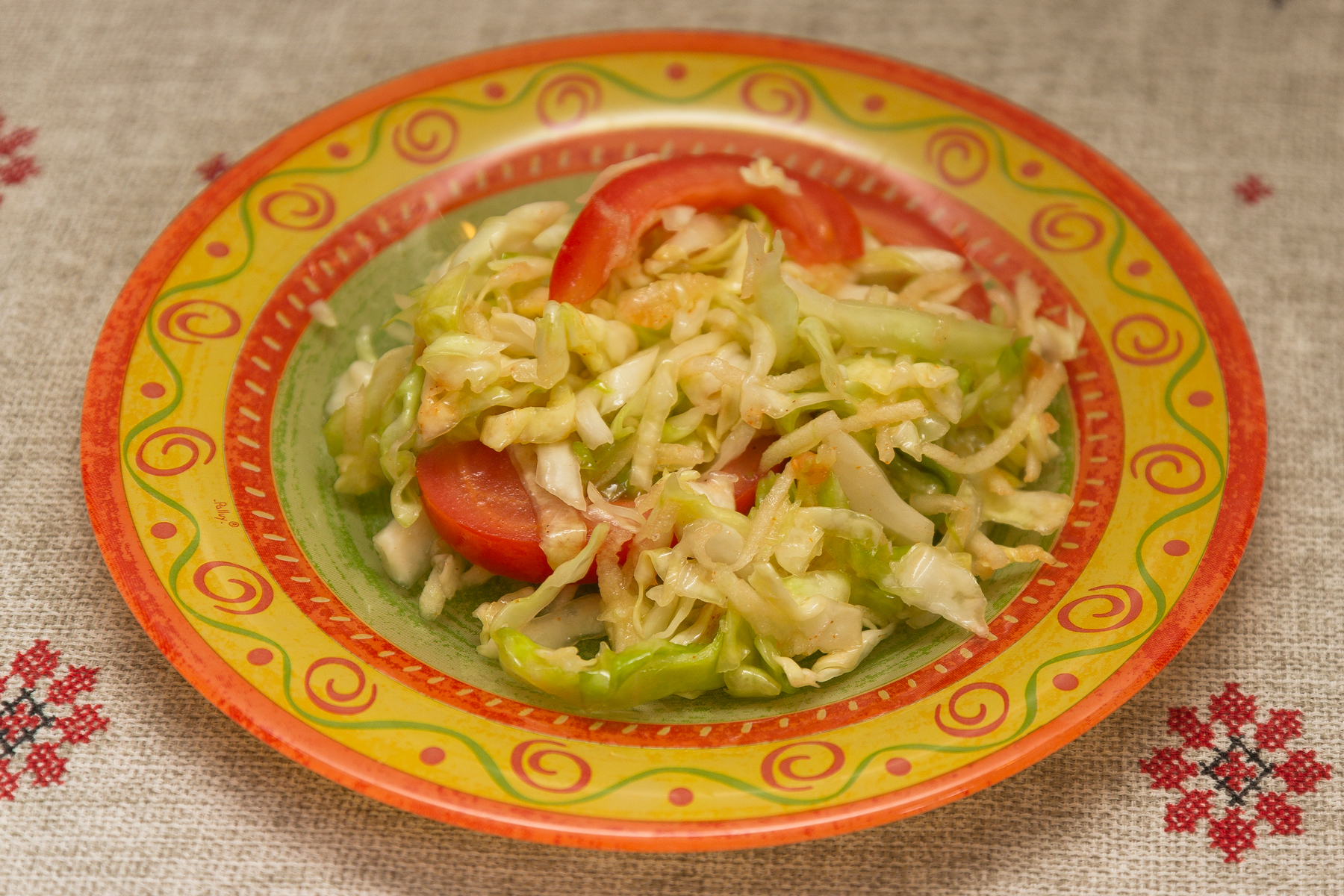Капусту выложите в салатник. Добавьте яблоки и помидоры. Полейте салат растительным маслом, добавьте сахар и красный молотый перец. Хорошо перемешайте.