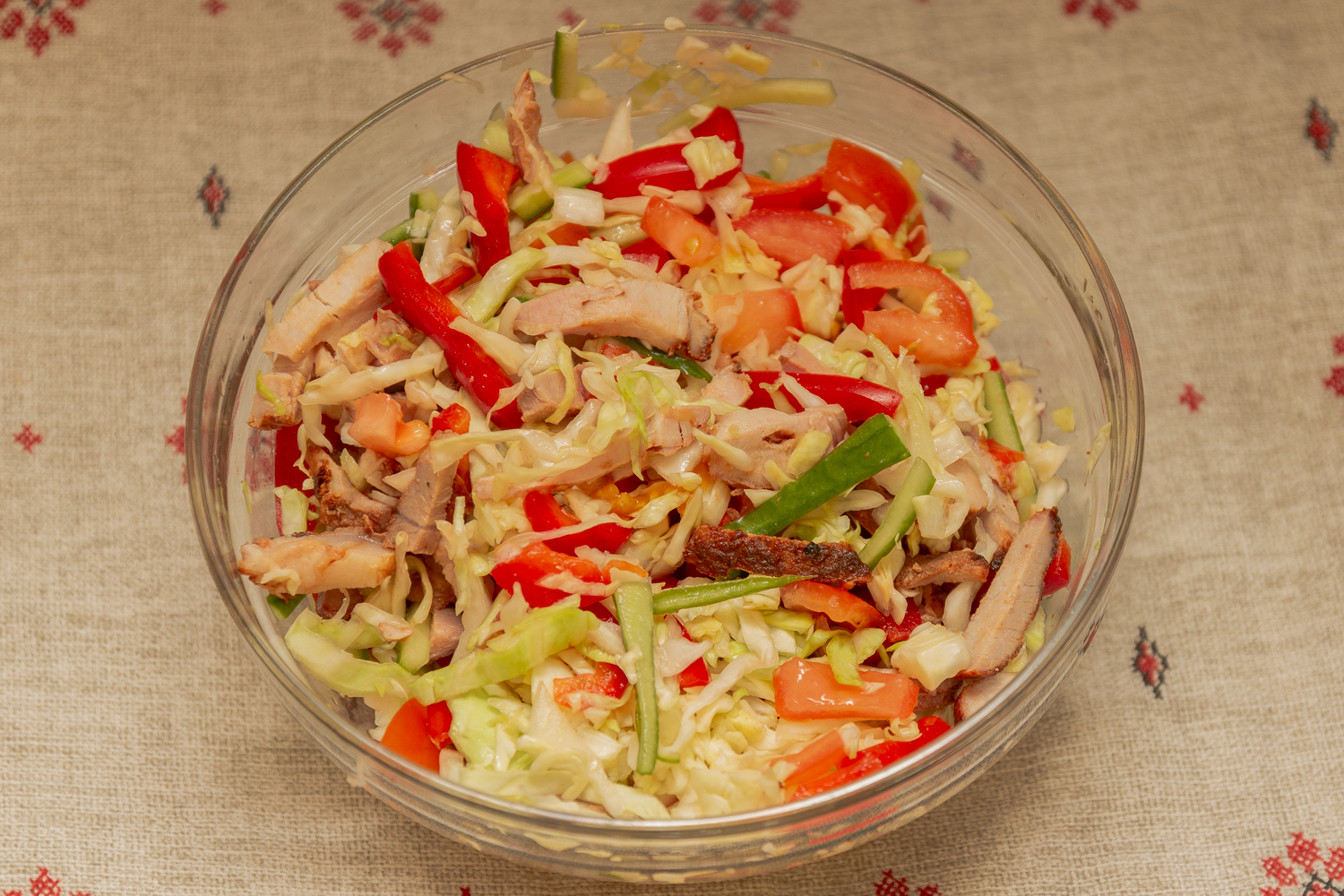 Добавьте к овощам нарезанный шашлык и все перемешайте.