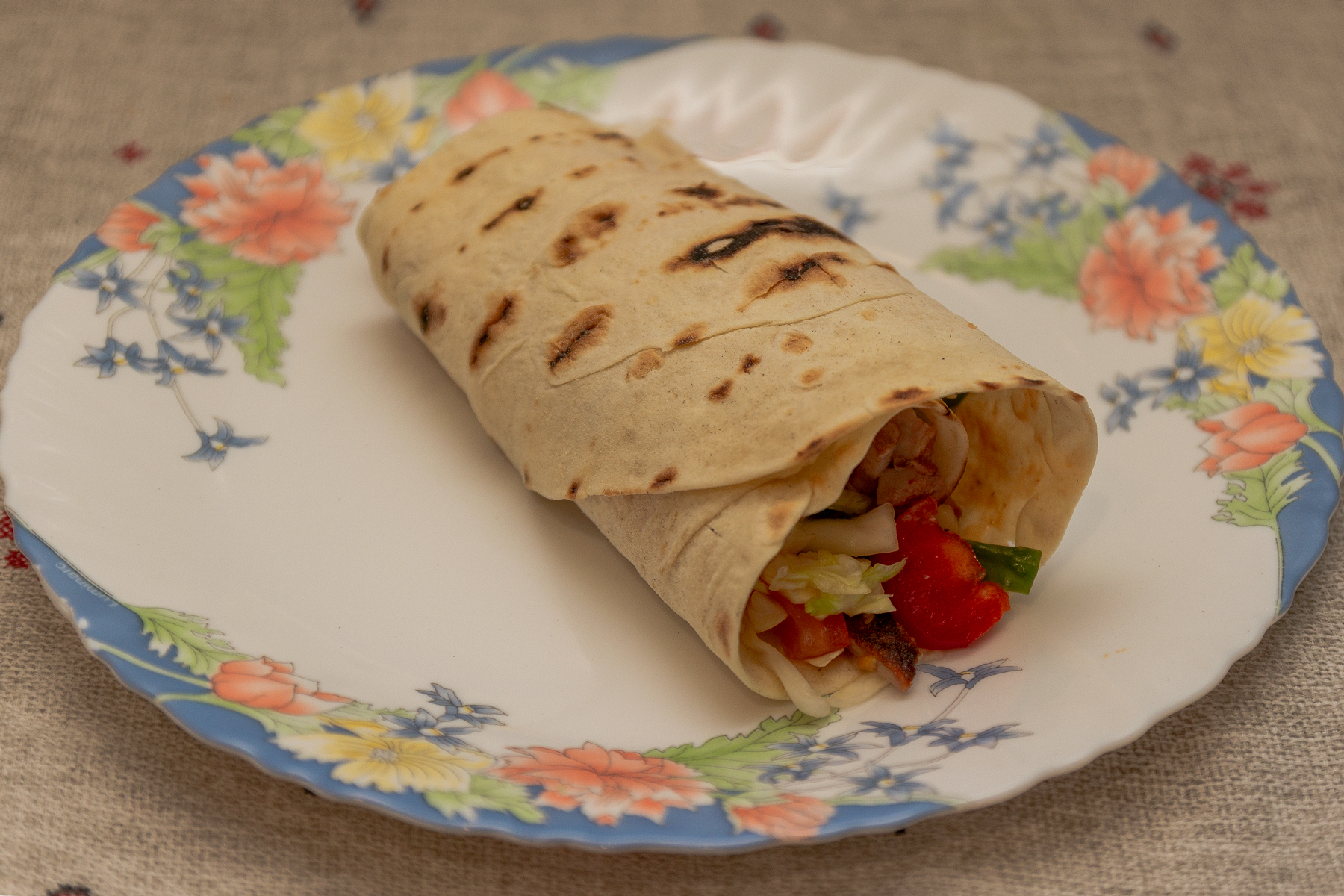 Лаваш разверните. Выложите на край лаваша начинку, полейте ее любимым соусом и плотно сверните рулетом, подворачивая края.