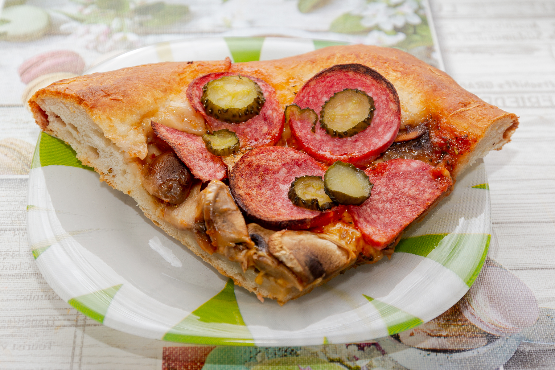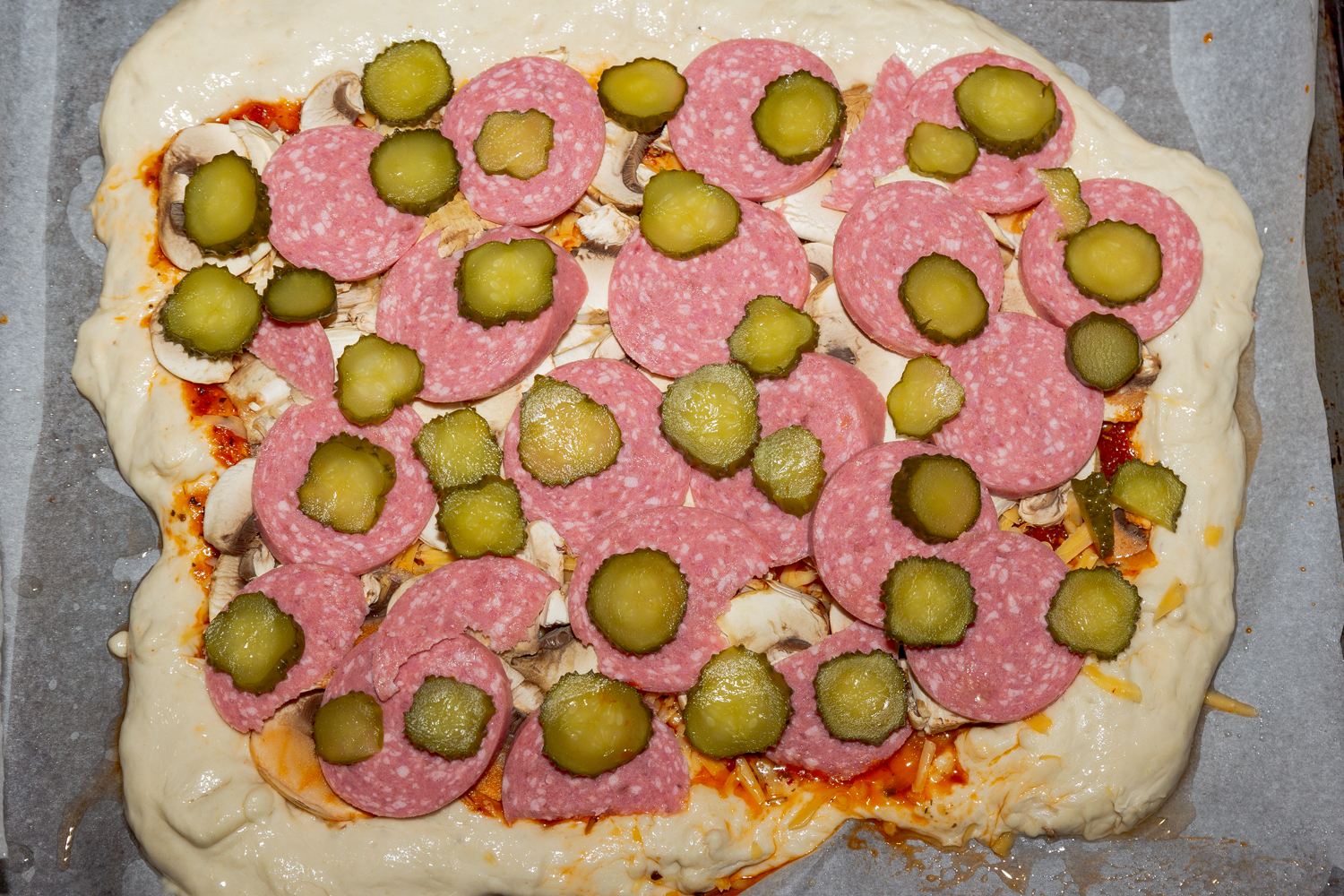Огурец нарезать кружочками. Колбасу нарежьте кружочками. Раскатать в круглый пласт тесто на припыленной мукой поверхности. Выложить круглую основу на противень, устеленный пергаментной бумагой. Силиконовой кистью смазать бортики теста оливковым маслом. Это нужно для хрустящих и румяных краёв. После чего, обильно размазать томатный соус, не выступая на бортики. Пиццу собрать в такой последовательности: первый слой сыр,