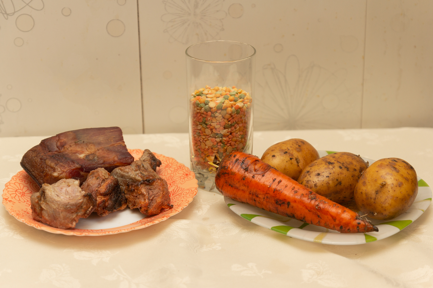 Наливаем в кастрюлю воду и ставим ее на сильный огонь. В дуршлаге промываем горох и закидываем в кастрюлю с водой. Доводим до кипения, закрываем крышкой, убавляем огонь до минимума и варим горох до готовности. Маленький огонь нужен для того, чтобы горох на дне не подгорал. Нарезаем шашлык небольшими кусочками. Шашлык сразу отправляется в кастрюлю к гороху. Лук нарезаем кольцами. Морковь натираем на крупной терке.