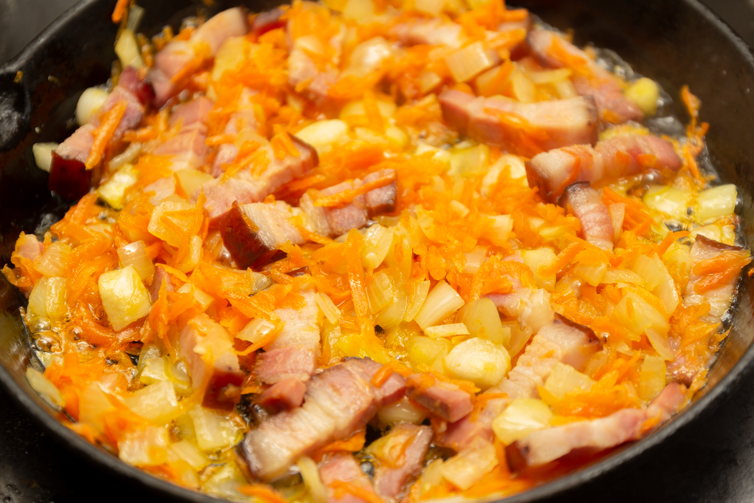 Грудинку нарежьте произвольными кусочками. Разогреваем в сковороде растительное масло и пассеруем лук, морковь и грудинку.