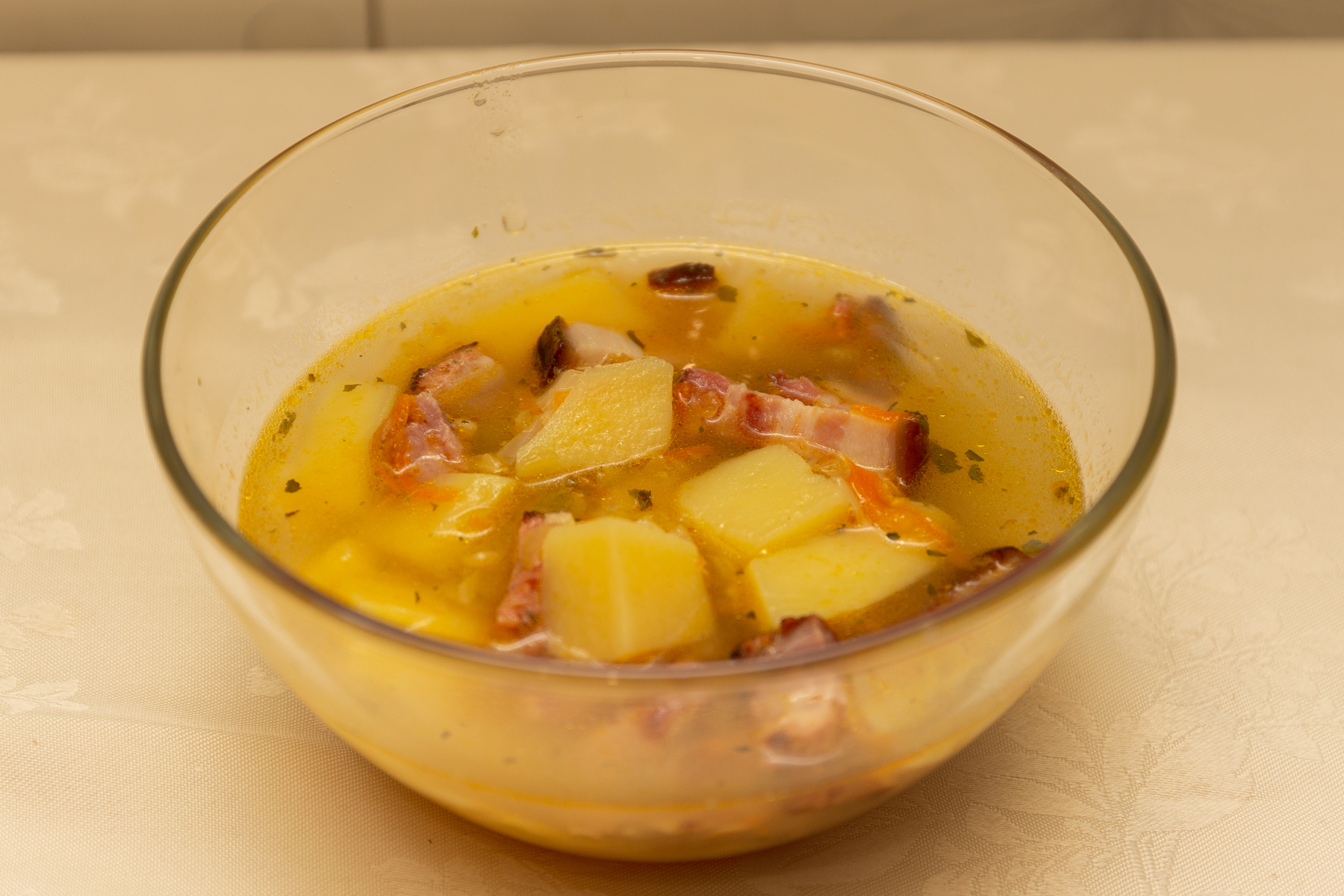 Картофель чистим и нарезаем небольшими кусочками. Как только горох в кастрюле дошел до готовности, добавляем в кастрюлю картофель и зажарку. Суп посолите по вкусу. Варим до готовности картошки. После чего выключаем огонь, пробуем. При необходимости правим на соль. Даем супу минут 15 «отдохнуть» и разливаем по тарелкам.