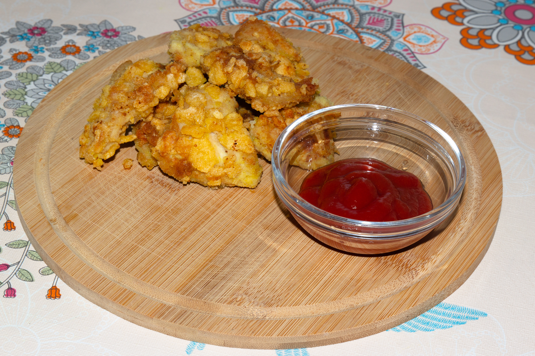 Измельчаем в блендере кукурузные хлопья, смешиваем с панировочными сухарями и мукой. Для цвета добавляем в панировку немного паприки.