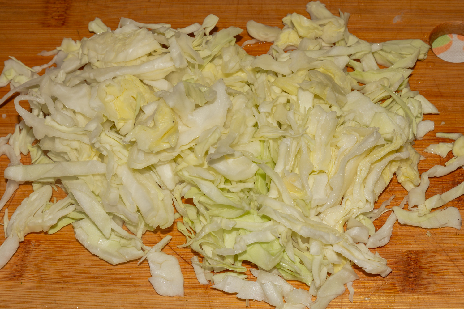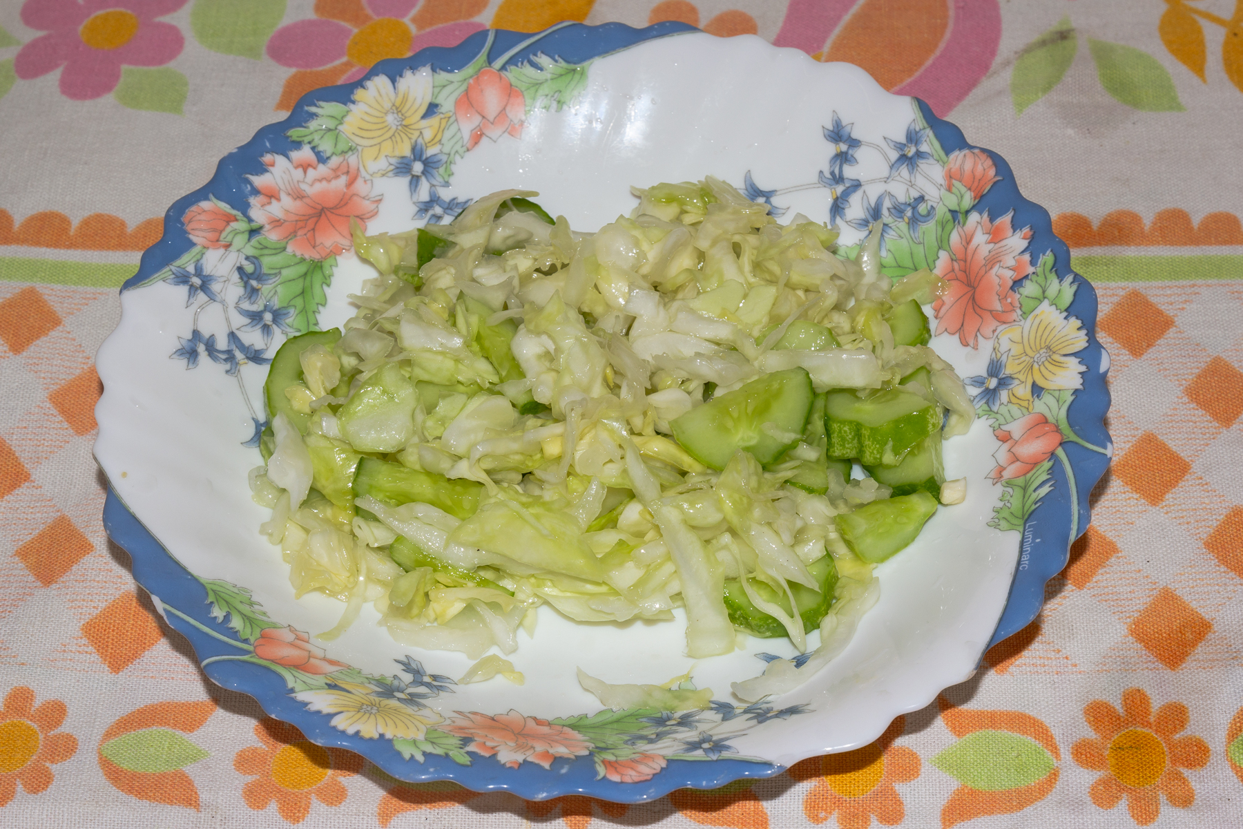 Добавить соль. Капусту перетереть с солью до появления сока. Нарезать огурцы произвольно.