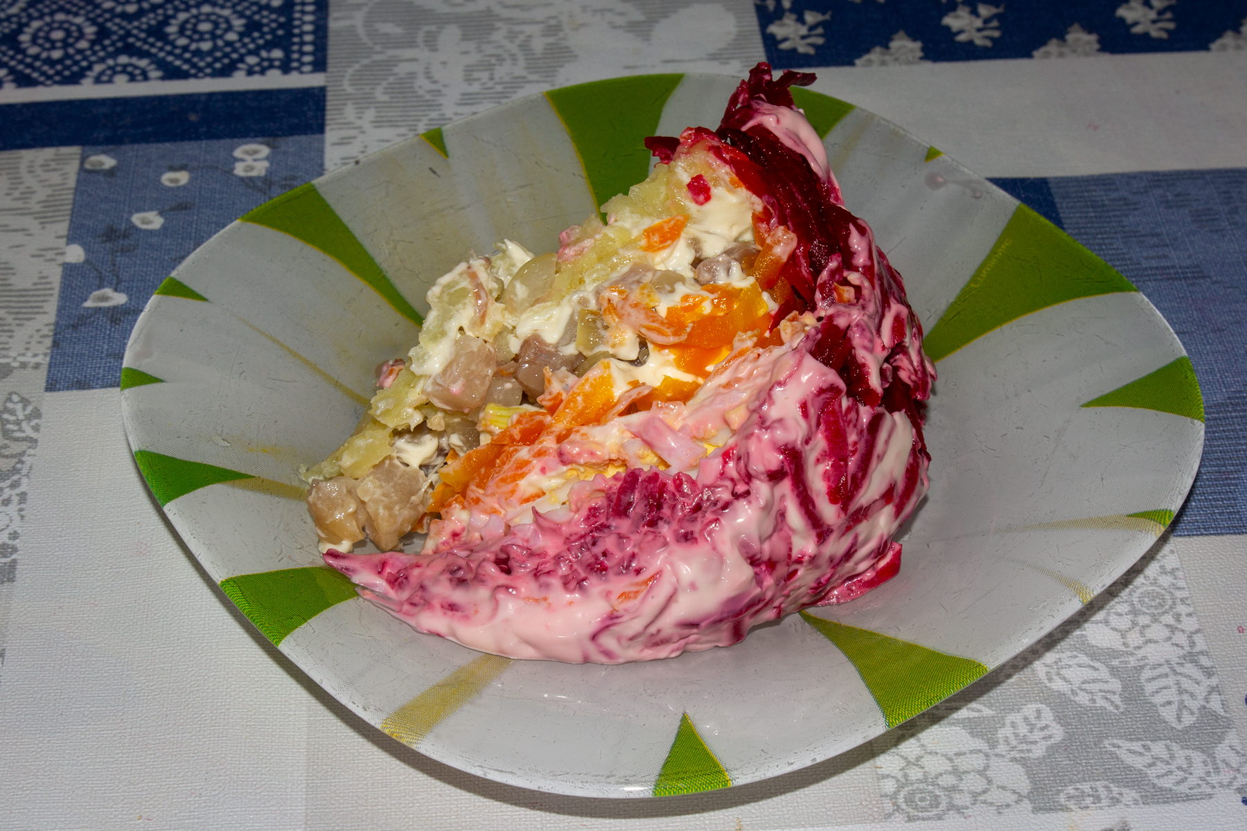 Яйца и овощи отварите (свеклу отдельно), остудите, очистите и натрите на крупной терке. Луковицу очистите и измельчите ножом. Филе сельди мелко нарежьте или пропустите через мясорубку и смешайте с луком. Выкладывайте слоями подготовленные картофель,