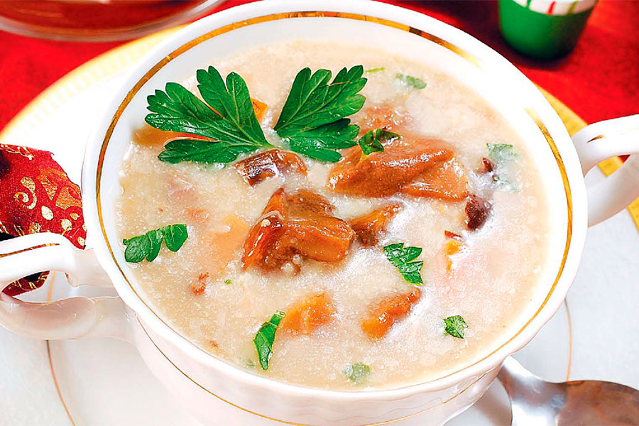Грибы промойте, крупные нарежьте. Лук измельчите. Жарьте грибы с луком в масле 15 минут. Добавьте очищенный и нарезанный кубиками картофель, лавровый лист. Влейте 1 л горячей воды, посолите и варите 20 минут. Загустите суп поджаренной без масла мукой, заправьте сливками. Украсьте зеленью.
