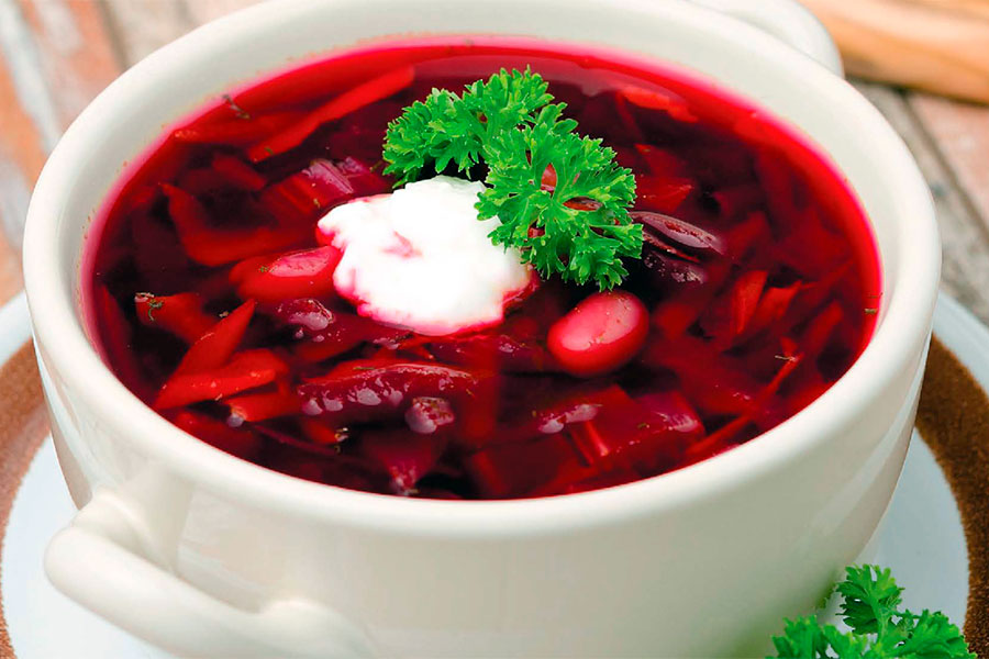 Мясо залейте 3 л холодной воды, готовьте 1,5 часа после закипания с корнем петрушки, горошинами перца и лавровым листом. Удалите специи, мясо нарежьте кусочками. Добавьте нашинкованную капусту и нарезанный кубиками картофель. Посолите, варите 15 минут. Измельченные морковь и лук слегка обжарьте в масле и добавьте в суп с протертыми помидорами. Готовьте вместе еще 10 минут. Очищенную свеклу натрите и тушите с половиной сала и уксусом 20 минут, выложите в суп. Очищенный чеснок растолките в ступке, перетрите с кусочками оставшегося сала и заправьте борщ. Приправьте сахаром. В тарелки разложите кусочки мяса, фасоль, зелень петрушки и добавьте сметану.