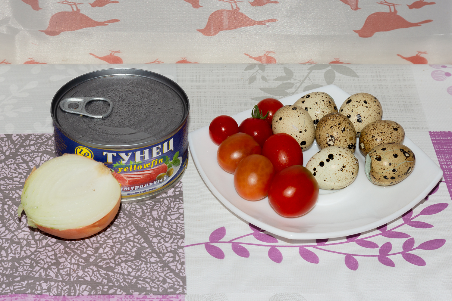 Перепелиные яйца отправляем варить (хватит 3 минут кипения), черри и зелень моем, а лук очищаем. Для начала приготовим соус с оливкового масла, винного уксуса, соли, сахара и свежемолотого перца, регулируем все на свой вкус. Соус хорошо перемешиваем. Половинку лука тоненько нарезаем полукольцами и отправляем в наш соус мариноваться. Сваренный перепелиные яйца очищаем и нарезаем четвертинками, тоже делаем с черри.