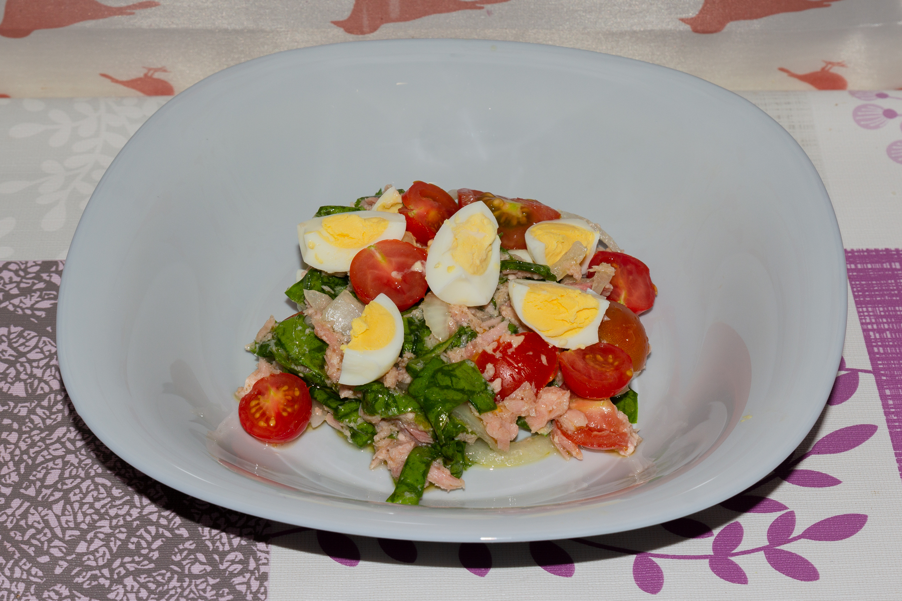 зелень просушиваем на салфетке от влаги и нарываем произвольно. зелень поливаем нашей заправкой, хорошенько перемешиваем. Зелень выкладываем на тарелку, сверху выкладываем наши помидорки черри и яйца, добавляем раскрошенный тунец и лучок и еще сверху можно полить остатками соуса.