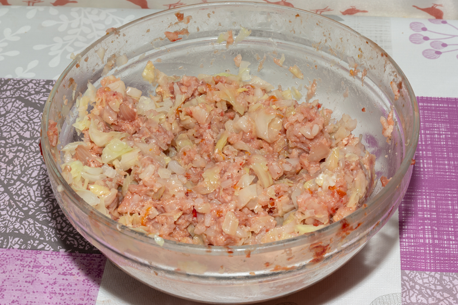 Сначала займемся рисом. Хорошо его промойте, минимум в пяти водах, залейте холодной фильтрованной водой в соотношении 1:2, немного посолите и поставьте на огонь. Когда рис закипит, выключите огонь, накройте крышкой и оставьте запариваться. Тем временем нарежьте капусту кубиками или тонкой соломкой. Переложите капусту в кастрюлю, залейте ее кипятком, чтобы ушла лишняя горечь. На пять-десять минут, в зависимости от капусты. Спустя положенное время капусту откиньте на дуршлаг. Воду сохраните, она понадобится для соуса. Лук очистите и нарежьте кубиками. Если в рисе осталась вода, то слейте ее. В миску сложите вместе капусту, рис, лук и фарш. Посолите, поперчите, приправьте по вкусу. Хорошо вымешайте фарш.