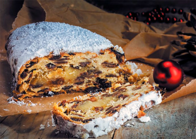 Соединить цукаты, изюм и миндаль, залить ромом, оставить на 6—12 часов. Для опары 100 мл теплого молока (35 °С) перемешать с дрожжами, всыпать 1 ст. л. сахара и 2 ст. л. муки, поставить в теплое место на 20 минут. Оставшееся молоко соединить с яйцами, слегка взбить, добавить цедру, специи и щепотку соли. Сливочное масло комнатной температуры растереть с сахаром добела. В подошедшую опару добавить молочную смесь и масляную массу, перемешать. Всыпать муку, замесить тесто. Вымешивать около 10 минут. Тесто должно стать эластичным и отставать от рук. Поставить его в теплое место для подъема примерно на 2 часа. Подошедшее тесто обмять, вмешать смесь цукатов с ромом. Раскатать тесто в удлиненный пласт толщиной 2 см. Сформовать штоллен особым образом: пласт сложить пополам так, чтобы нижняя часть была на несколько сантиметров больше верхней. Выложить штоллен на противень, выстеленный пергаментом, накрыть пленкой и оставить для расстойки на 30—40 минут. Выпекать в духовке при температуре 160 °С около 1 часа.