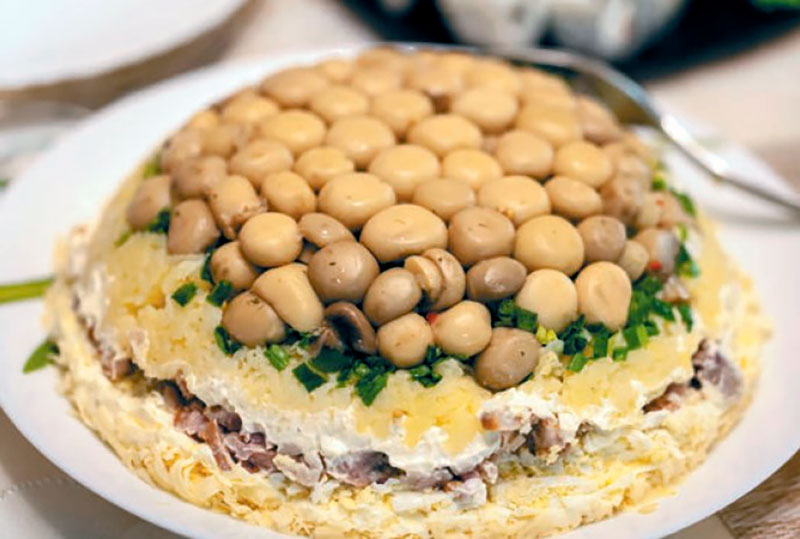 Глубокий салатник выстелить пищевой пленкой, уложить в один слой маринованные шампиньоны шляпками вниз, посыпать рубленой зеленью, смазать майонезом. Сверху уложить мелко нарубленные яйца, смазать майонезом. Посыпать тертым сыром, смазать майонезом. Затем уложить ветчину, нарезанную мелкими кубиками, смазать майонезом. Следующим слоем уложить тертую морковь, смазать майонезом и накрыть тертым картофелем. Салат аккуратно утрамбовать ложкой, затянуть свободными концами пленки и поставить в холодильник на ночь. Перед подачей пленку развернуть, салатник накрыть сервировочной тарелкой и осторожно перевернуть. Аккуратно снять салатник и пленку. Подавать салат, украсив зеленью.