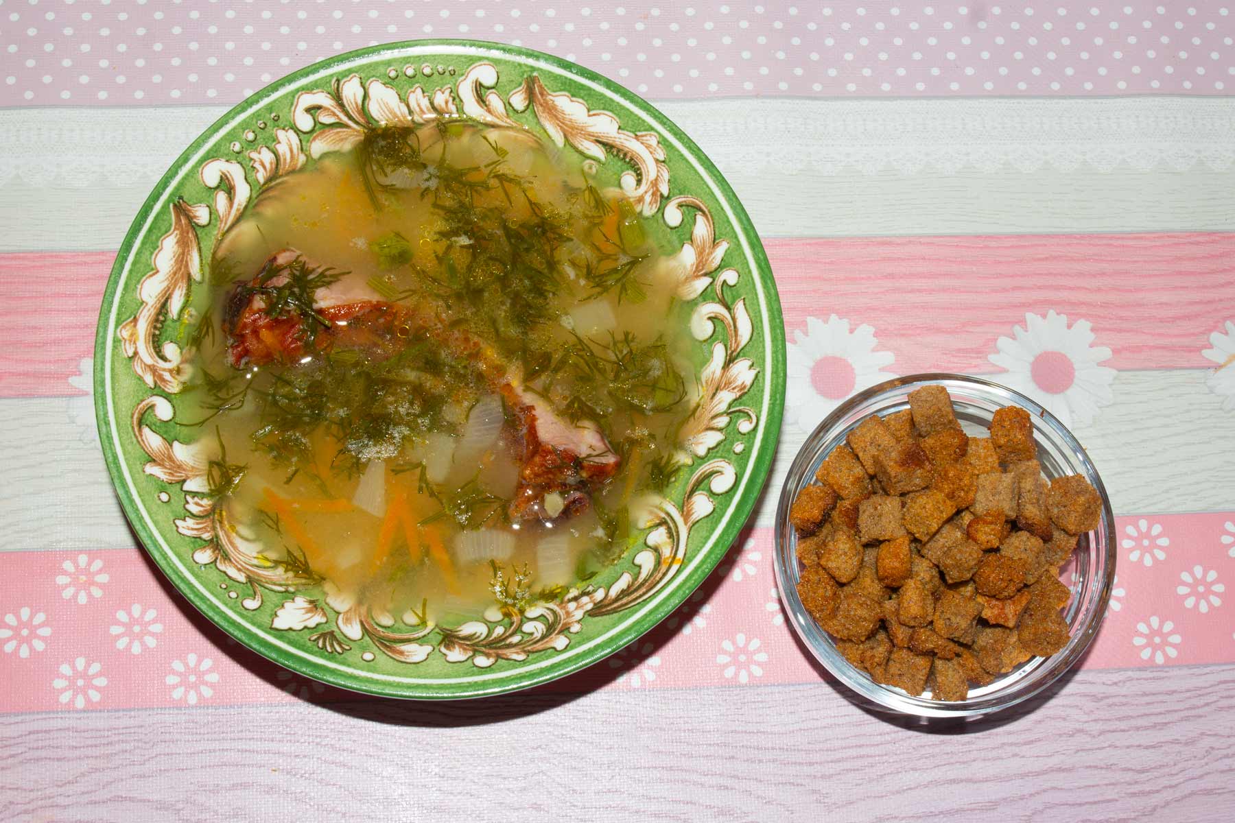 2—2,5 л воды, 400—500 г копченых ребрышек, 250—300 г копченостей (грудинка, шпик, колбаса, окорочок), 250—300 г сушеного гороха, 3 картофелины, 1 головка репчатого лука, 1 морковь, 1 ст. л. растительного масла или жира, лавровый лист, черный и душистый перец горошком, соль по вкусу, рубленая зелень петрушки и укропа для подачи