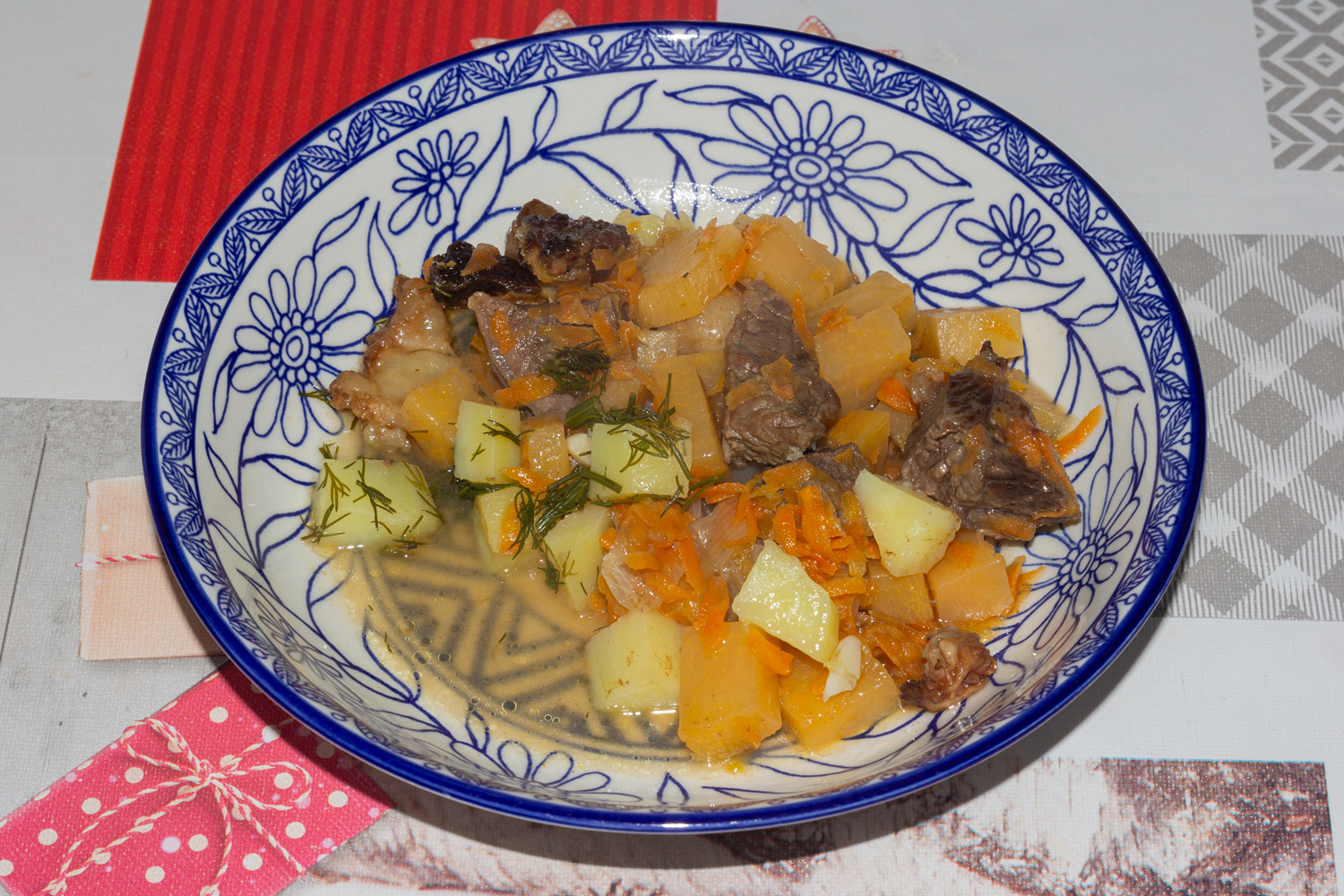 1 кг говядины, 3—4 луковицы, 4—5 картофелин, 1 морковь, ⅓ корня сельдерея, 2—3 зубчика чеснока, 2—3 ст. л. томатной пасты, 600—700 мл говяжьего бульона или воды, зелень, по ½ ч. л. молотого сладкого и острого перца, соль и другие специи по вкусу, растительное масло для жарки