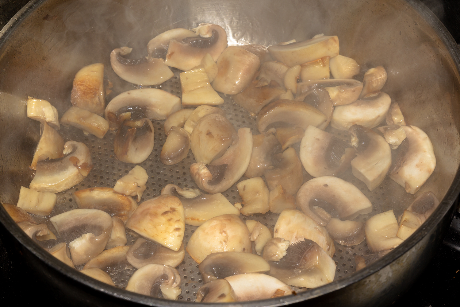 Шампиньоны очистите от загрязнений и нарежьте крупными кусочками. Разогрейте в глубокой сковороде растительное масло, выложите в неё грибы. Обжаривайте шампиньоны на среднем огне со всех сторон 5-6 минут.