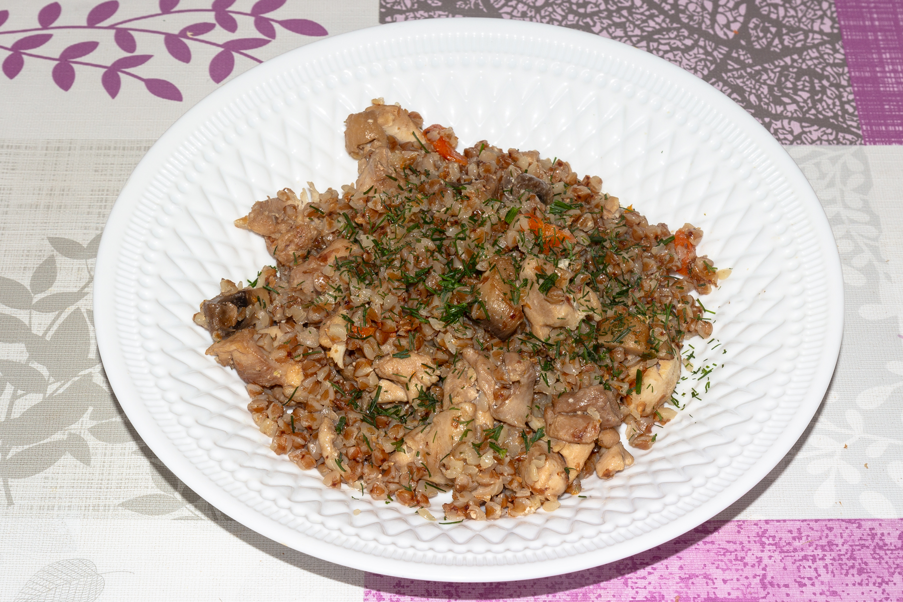Пока жарятся грибы, нарежьте очищенную морковь брусочками, а куриное филе - небольшими кубиками со стороной примерно 2 см. Куриное мясо отправьте в сковороду к грибам, обжарьте вместе 2-3 минуты, до изменения цвета курицы. Морковь добавьте в сковороду. Перемешайте и обжарьте ещё 4 минуты, до мягкости моркови. Гречневую крупу хорошо промойте под проточной водой и выложите в сковороду. Туда же всыпьте соль и приправу для курицы. Перемешайте и обжаривайте гречку 1-2 минуты так, чтобы каждая крупинка покрылась соками и маслом. Затем влейте в сковороду сливки.Добавьте 300 мл воды, доведите содержимое сковороды до кипения. Уменьшите огонь до минимального, готовьте гречку под крышкой 10-12 минут при слабом кипении. Когда вся жидкость испарится и впитается в крупу, выключите огонь и оставьте под крышкой на плите ещё на 5-10 минут.