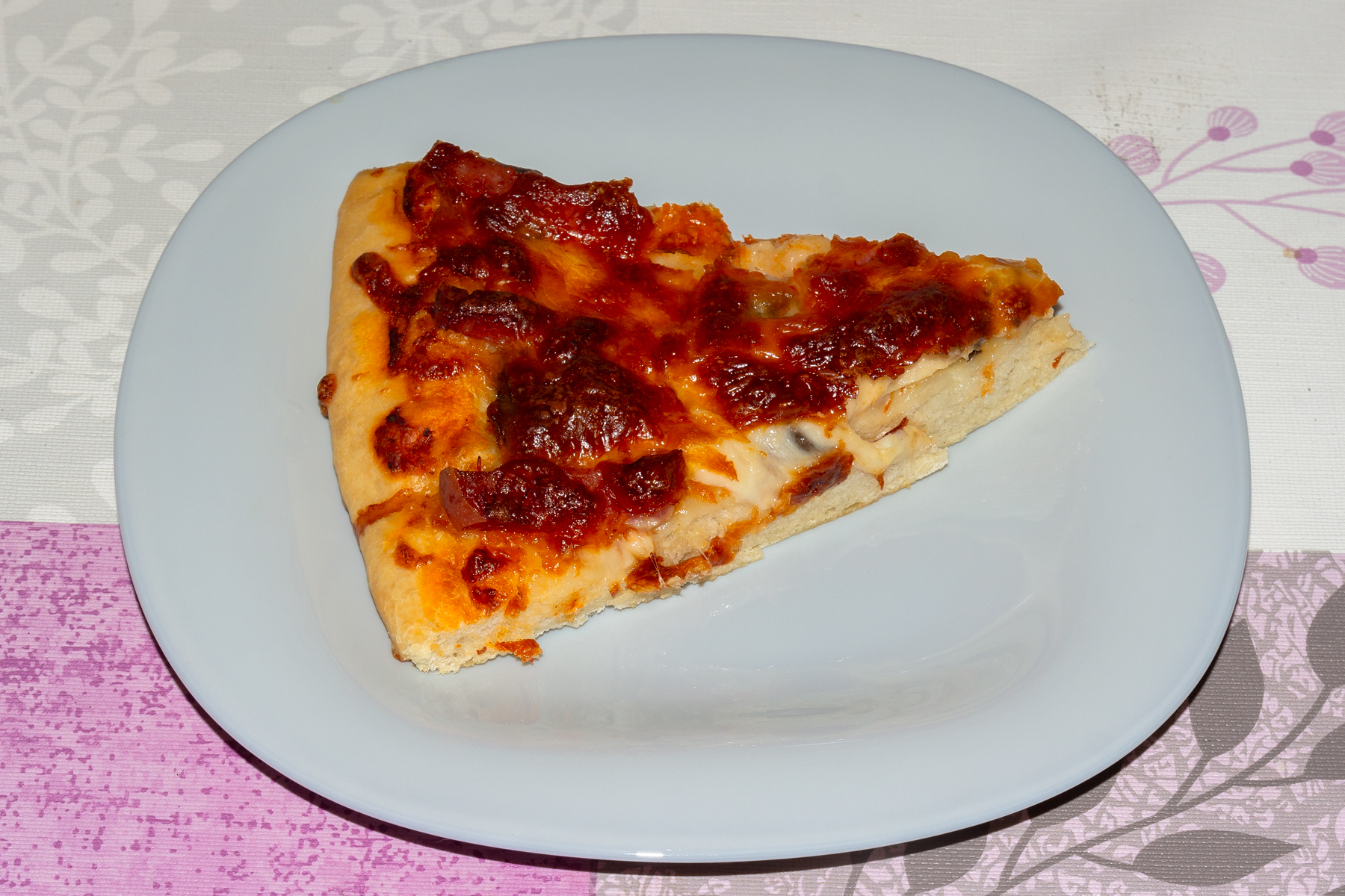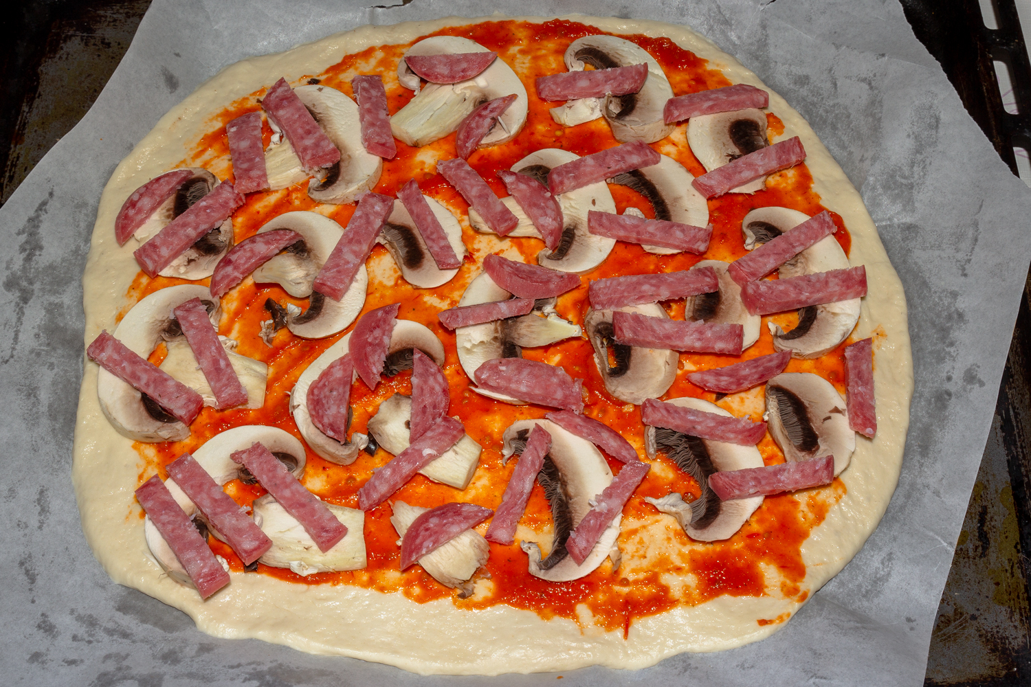 В теплую воду добавьте сахар, соль и дрожжи и перемешайте до однородного состояния. Вода должна быть именно теплой, но не обжигающей, иначе дрожжи в ней погибнут. Влейте растительное масло и перемешайте. Муку просейте через мелкое сито и частями добавьте в воду с дрожжами. Замесите мягкое, не липкое тесто. Месите его на столе не менее 5-7 минут, тогда оно получится нужной консистенции. Глубокую миску смажьте растительным маслом и положите в нее тесто. Покройте миску чистой тканью и оставьте в теплом месте для подъема примерно на 30 минут. Включите духовку на 180 градусов. Немного посыпьте стол мукой и выложите на него подошедшее тесто. Раскатайте тесто в тонкий круг и сделайте тонкий бортик. Смажьте тесто вместе с бортиками томатным соусом. Шампиньоны хорошо оботрите тряпочкой и нарежьте на тонкие пластинки. Разложите грибы по всей поверхности пиццы. Колбасу нарежьте соломкой и распределите по всей поверхности пиццы.