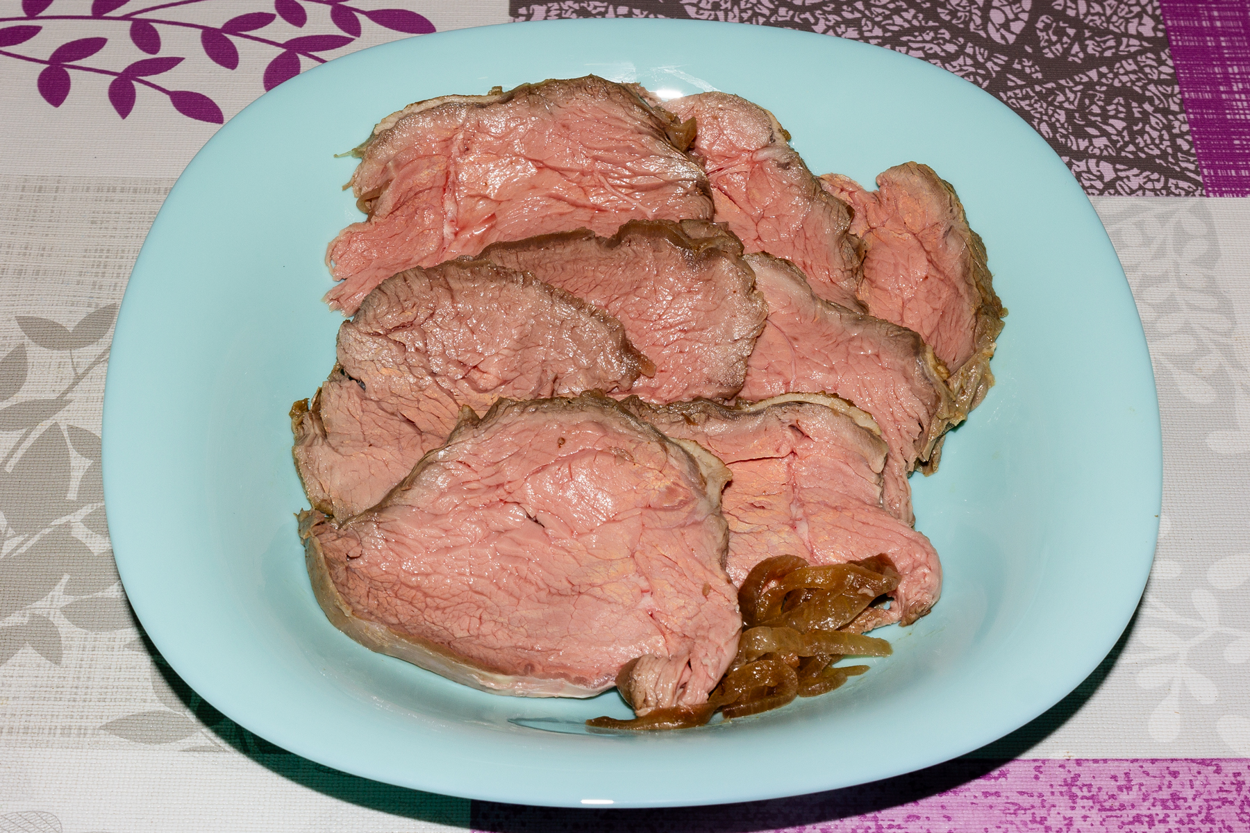 Мясо упаковать в фольгу. Выпекать при 100 градусах минимум 90 минут. Можно и дольше, все зависит от желаемой степени прожарки мяса. Мой кусок за 90 минут получил прожарку medium rare, его температура внутри составила 55 градусов. Лучше всего вооружиться термометром, он очень облегчит весь процесс – вы не передержите мясо и не пересушите его. Готовое мясо достаем из духовки и обязательно даем ему отдохнуть 15 минут, что все соки равномерно разошлись внутри.