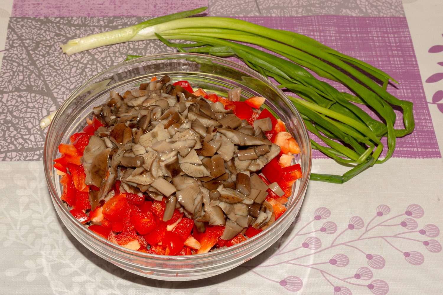 Тонкими пластинками нарезаем маринованные грибы и отправляем к уже нарезанным ингредиентам.