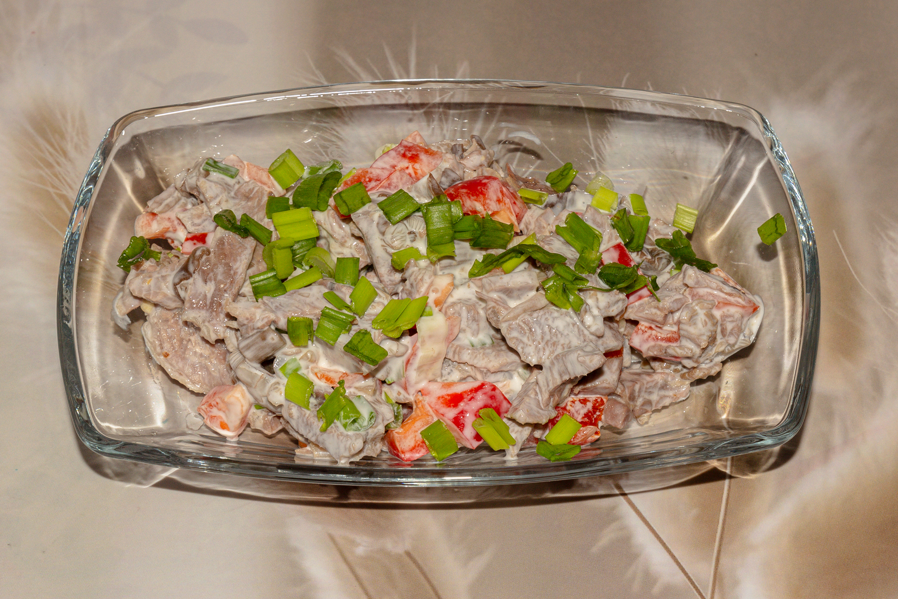 Для заправки салата необходимо смешать 2 ст.л. лимонного сока, 180 г сметаны и 1 ст.л. хрена. В ингредиенты салата отправляем нашу заправку, перемешиваем и украшаем зеленью.
