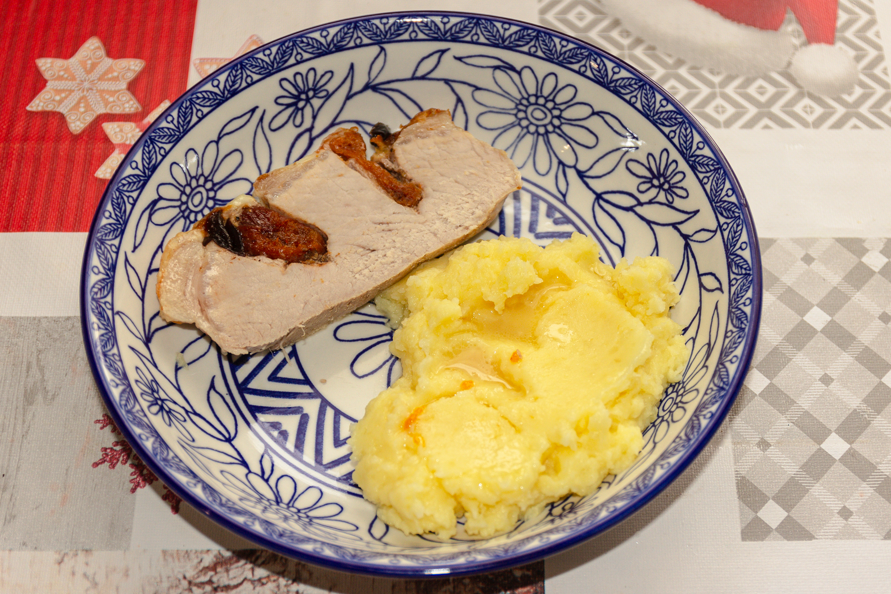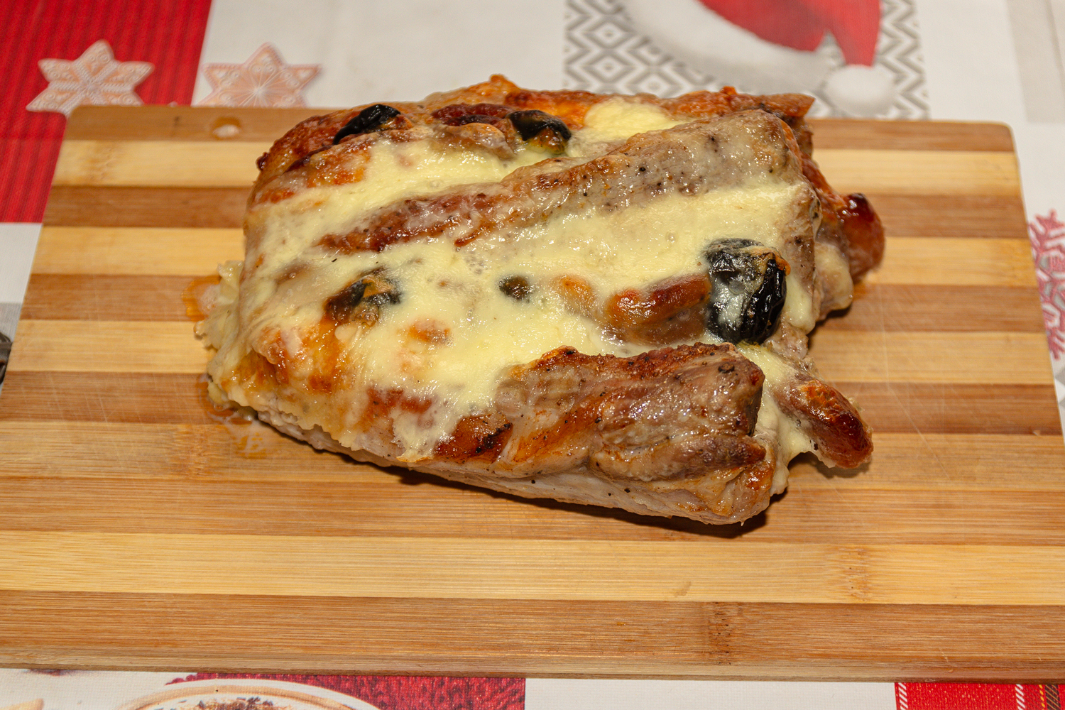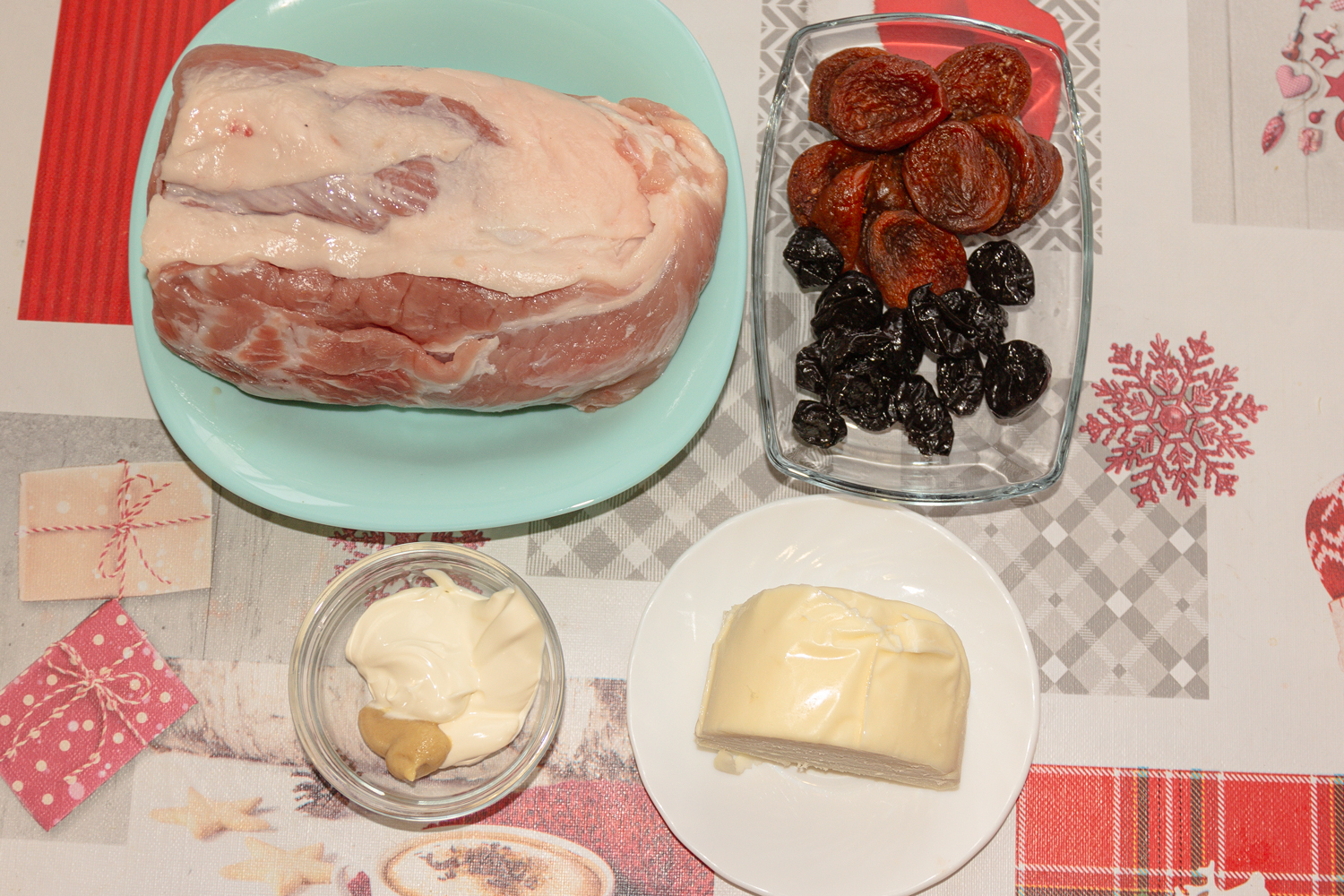 Кусок свинины обмыть, обсушить полотенцем, нашпиговать курагой, черносливом и нарезанным сыром.