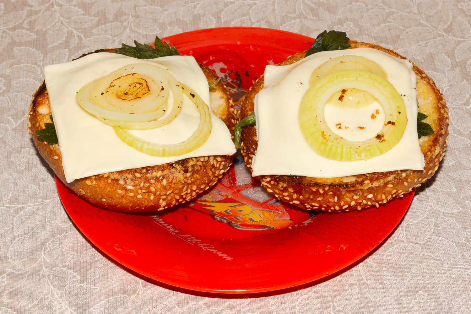 Обжарьте колбасу. Колбасу перевернуть, выложить сыр, чтобы он подтаял. Лук обжарьте. Низ булочки смазать кетчупом и майонезом.
