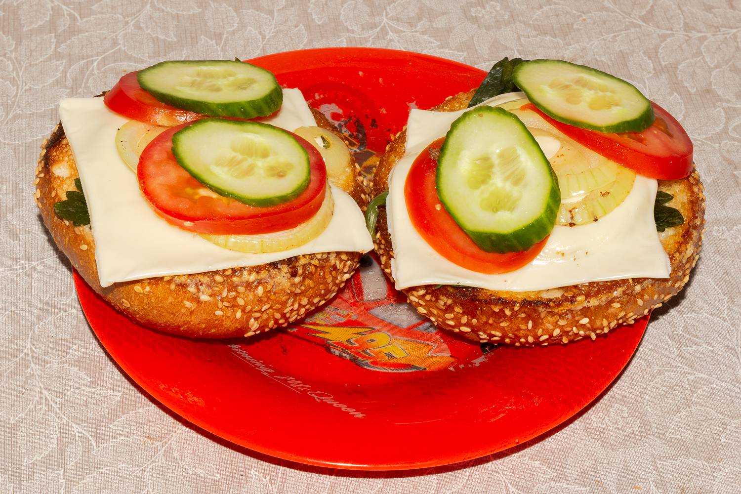Помидоры, огурец, лук, сыр и колбасу нарезать произвольно. Булочку разрезать пополам, подогреть срезом вниз на сухой сковороде.