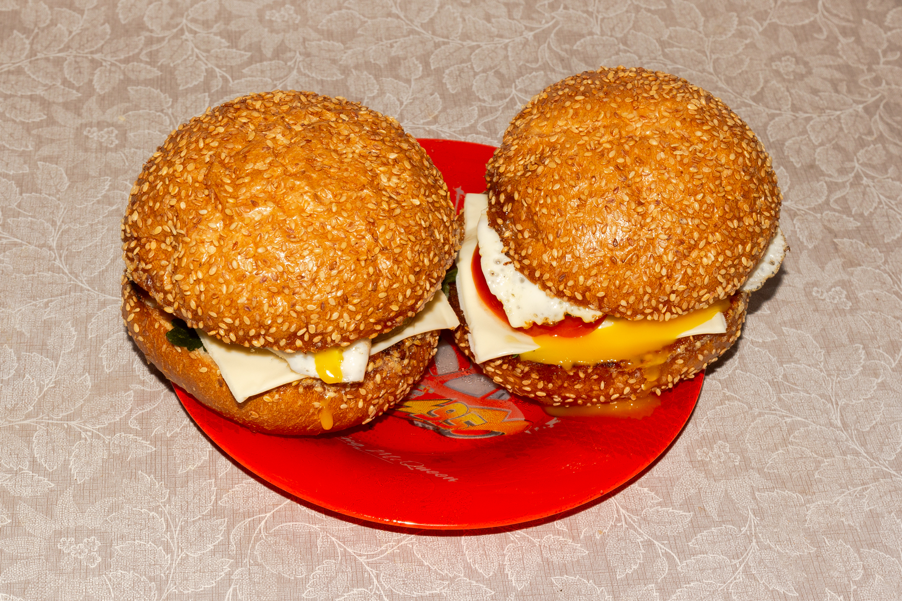 Нижнюю булочку "застелить" листьями салата и колбасой с сыром.