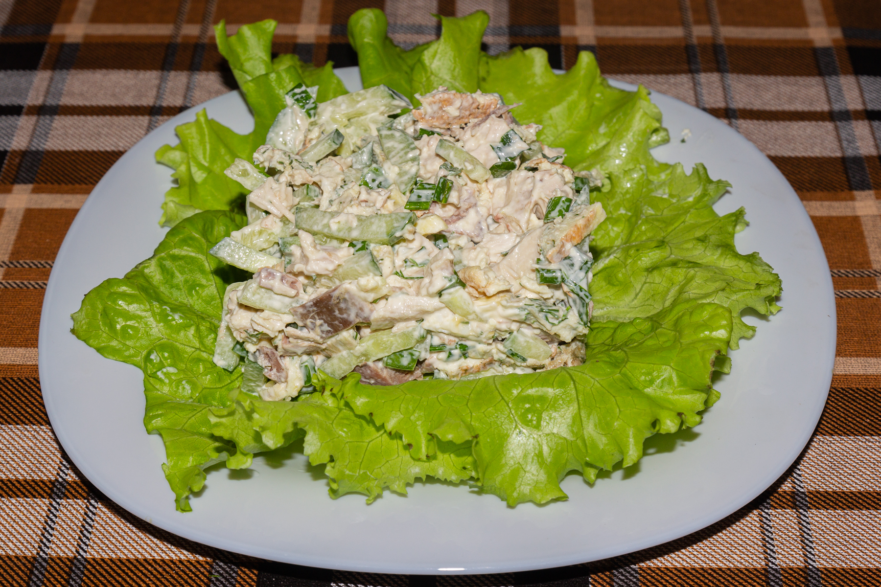Филе отварить в подсоленной воде, остудить, накрошить средними квадратами.