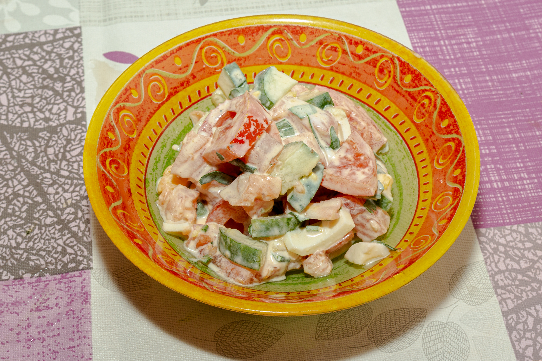 Яйца, рыбу, помидоры и огурец нарежьте кубиками.