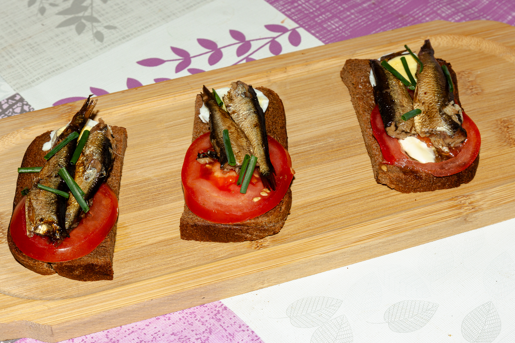 Булку нарезаем ломтиками около 1 сантиметра, выкладываем на противень, ставим в горячую духовку на 3-4 минуты. Каждый ломтик хлеба чуть смазываем майонезом. Вареные яйца нарежьте кружочками и выложите на хлеб. Сверху кладем крупную шпротину. Украшаем бутерброды веточкой любой свежей зелени.