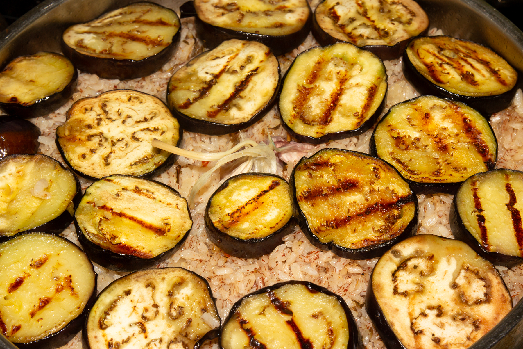 Выложить на бумажные салфетки, подсолить. Как только вода выкипит, в сотейник добавить масло и слегка обжарить говядину. Продолжая жарить, с небольшим интервалом добавить лук, морковь, помидоры и специи. Всыпать рис. Разровнять по поверхности. Влить 1,5 стакана воды, хорошо посолить. Довести до кипения. Тушить до тех пор, пока рис не впитает воду. По поверхности разложить кружки баклажан. Накрыть крышкой. Огонь убавить до минимума. Томить еще 20 минут.