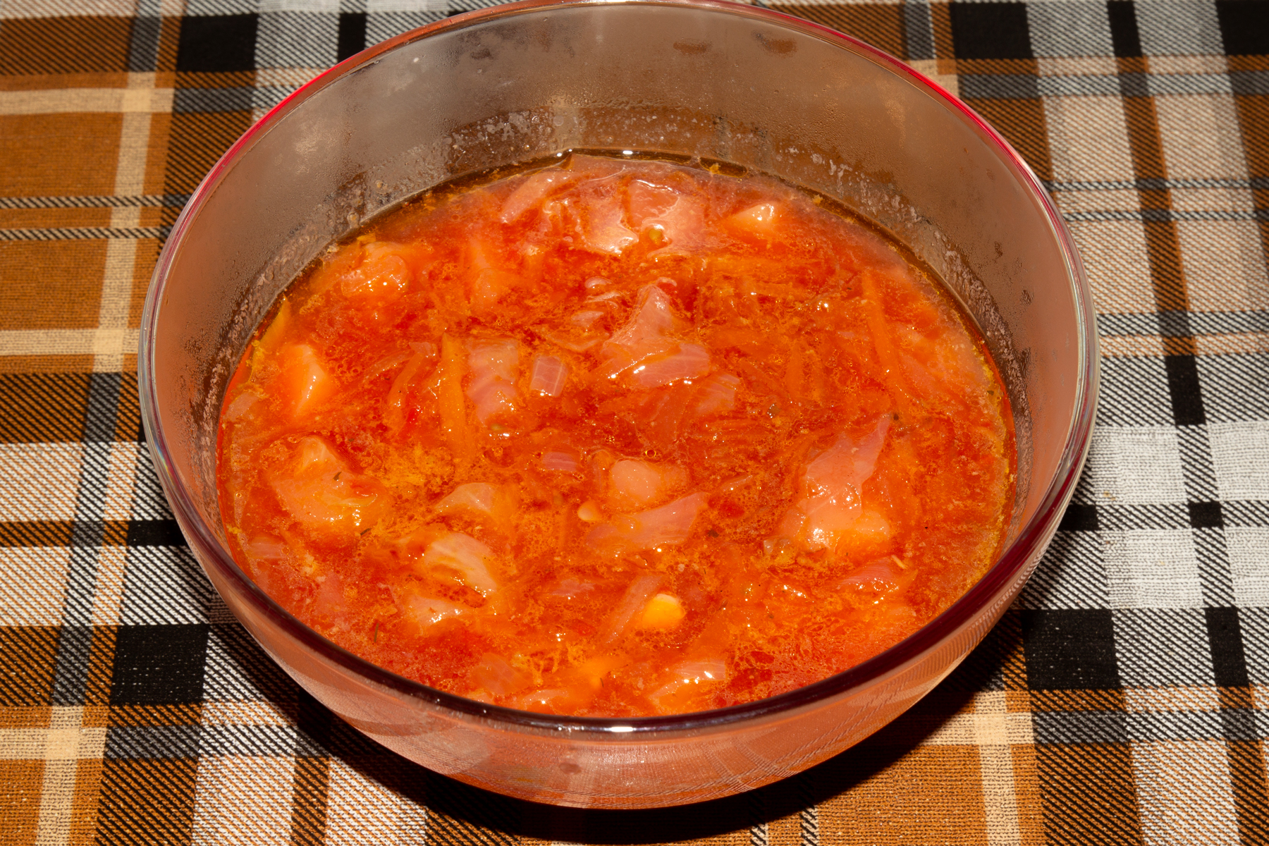 Очистите свеклу и хорошо промойте. Нарежьте небольшими кубиками или тонкой соломкой. По желанию, можно натереть на крупной терке. Промойте кабачок, нарежьте кубиками. Если кабачки зрелые, удалите кожуру и семена. В бульон добавьте кабачки и очищенную картошку. Добавьте нашинкованную белокочанную капусту и нарезанный соломкой сладкий перец. Доведите до кипения. Варите 5-10 минут с момента закипания. Промойте помидоры, разрежьте пополам, натрите на крупной терке. Кожицу удалите. Морковь натрите на крупной терке, лук нарежьте небольшими кубиками.