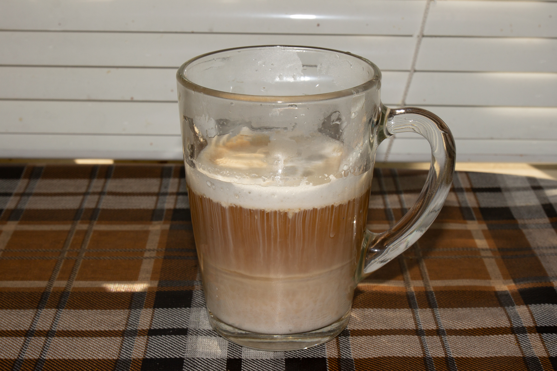 Сварите кофе. Взбейте молоко. К эспрессо добавьте молоко. Добавьте корицу и сахар.