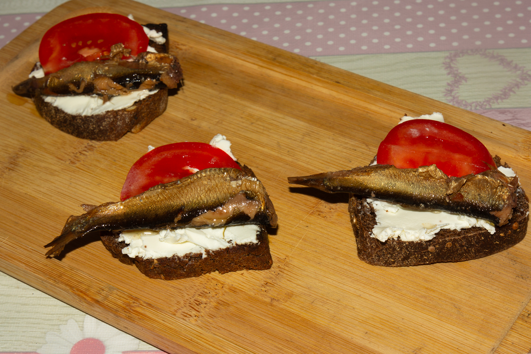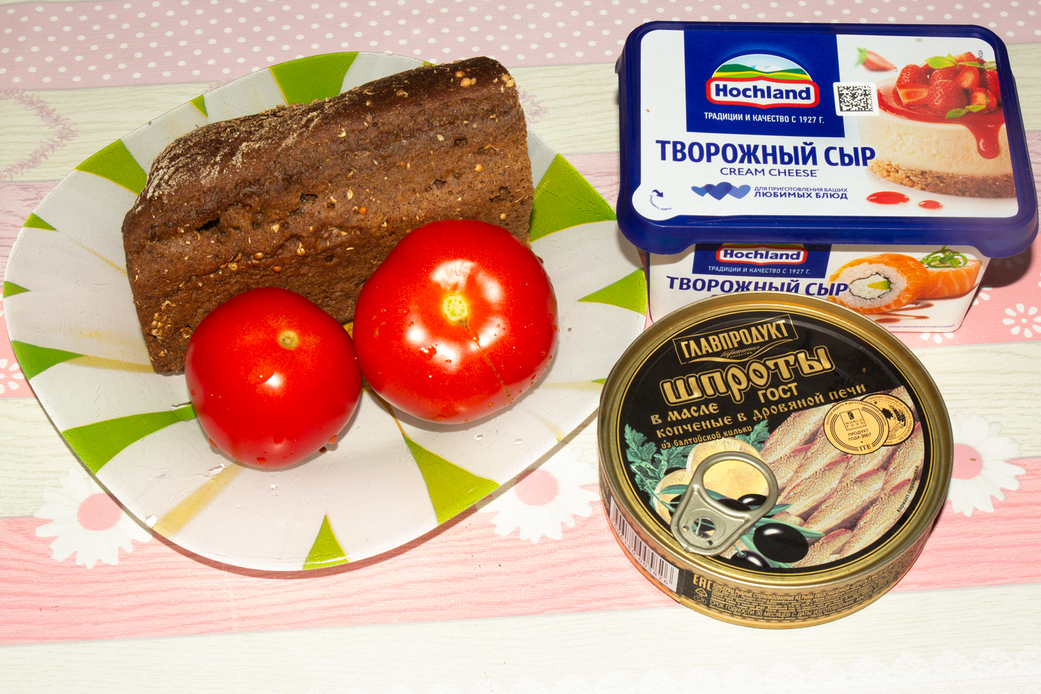 Творожный сыр смешайте с солью и специями. Хлеб нарезать на кусочки и смазать творожным сыром. Разложить на хлеб шпроты. Тонкими ломтиками нарезать помидор и разложить на все бутерброды. Сверху присыпать солью и перцем.