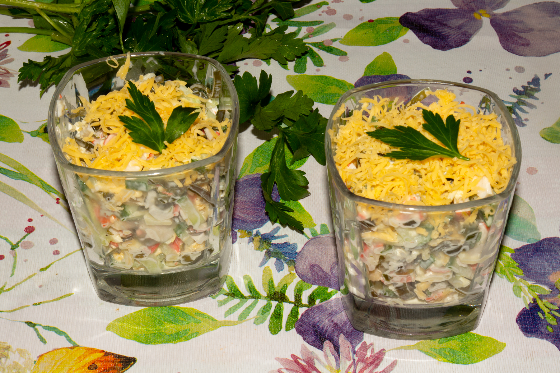 Переложить морскую капусту салатник, сыр натереть на терке. часть добавить в салат. а часть оставить на украшение салата. Свежий огурец сполоснуть и просушить, нарезать полосками или брусочками. Добавить в салат. Куриное яйцо отварить вкрутую, почистить и нарезать кубиками, добавить к остальным ингредиентам. Крабовые палочки нарезать кусочками и переложить в салат. Заправить все майонезом. Соль и перец добавить по своему вкусу, перемешать, посыпать сыром.