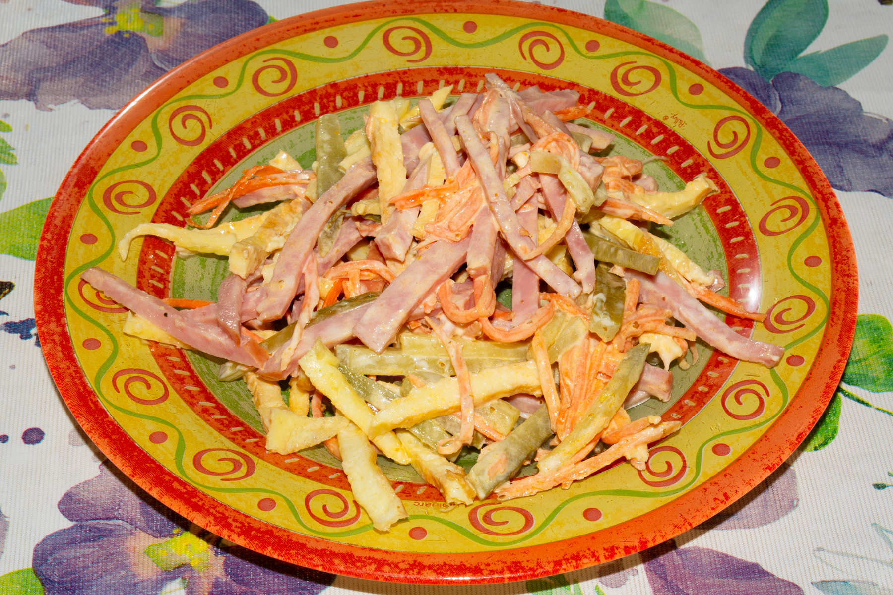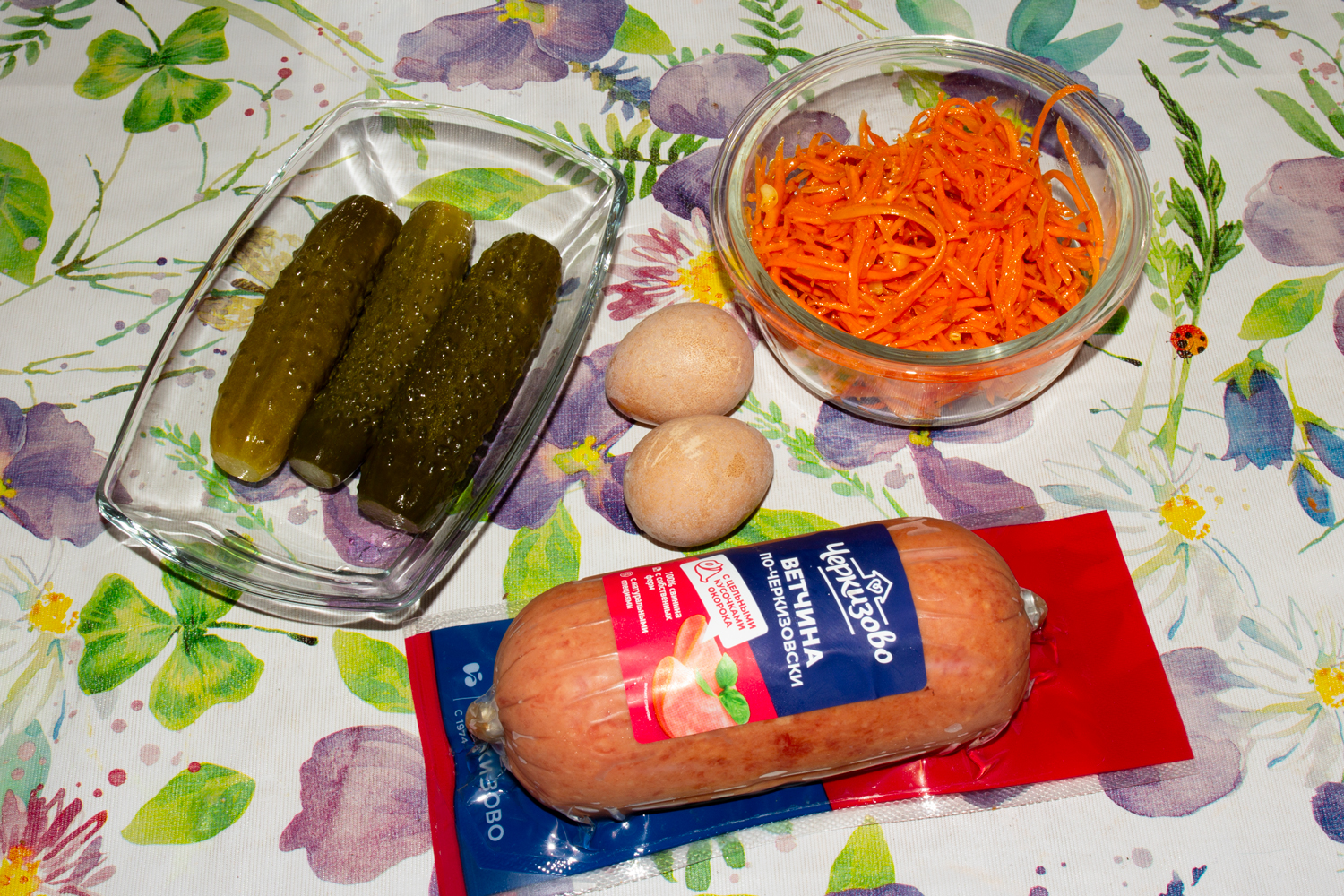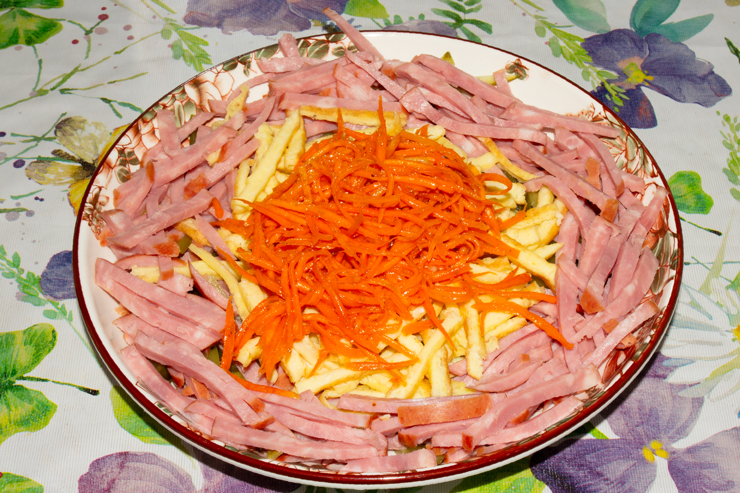 Яйца взбейте с молоком и обжарьте на сковороде. Полученный омлет нарежьте. Колбасу нарежьте соломкой. Мелко порубите укроп. Добавьте к подготовленным ингредиентам нарезанный огурец, морковь и майонез и перемешайте.