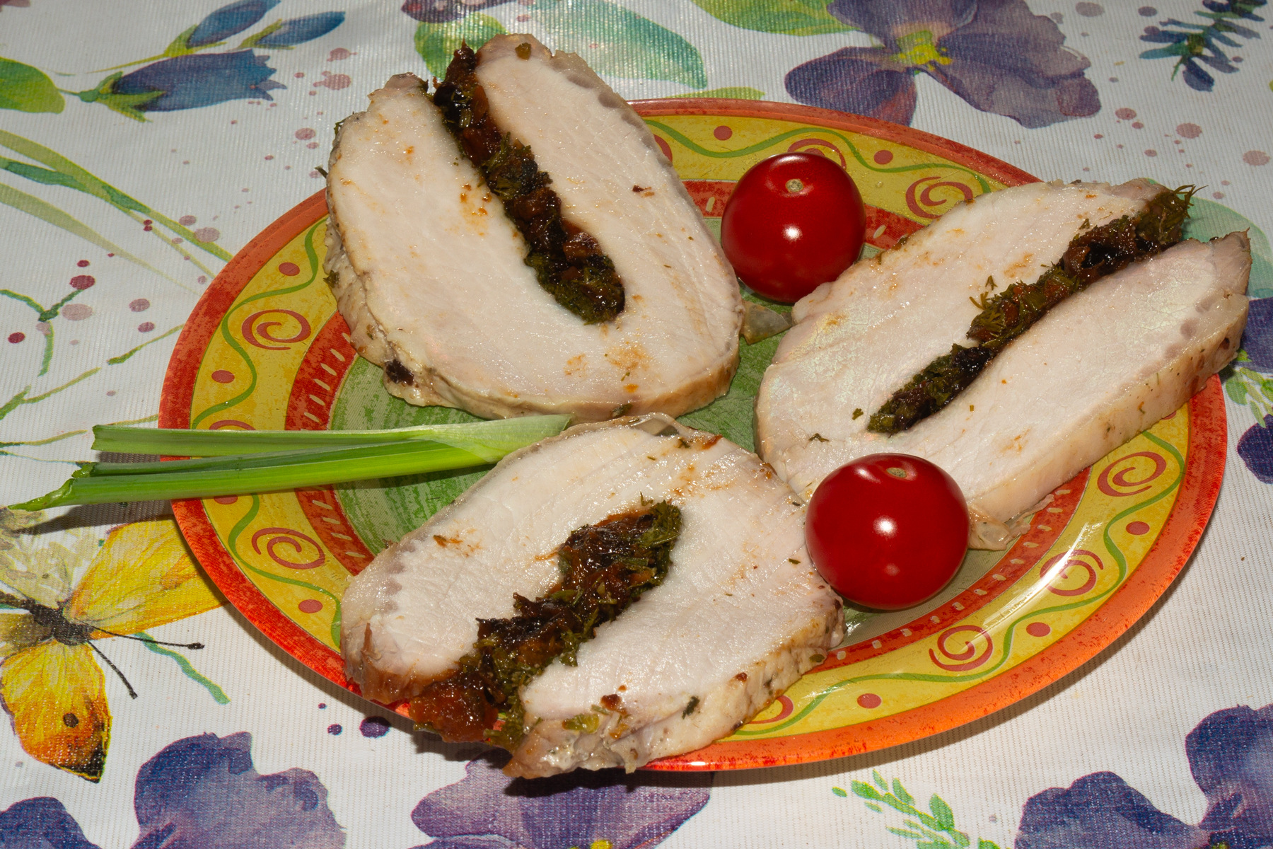 Курагу и чернослив залейте кипятком на 10 минут. Слейте воду, половину сухофруктов измельчить в блендере, половину - измельчите ножом. Свиную корейку промойте под холодной водой, обсушите бумажными полотенцами. Разрежьте пополам вдоль, как книгу. Хорошо натрите смесью перца и соли. На половину мясного пласта выложите сухофрукты, измельченную зелень.