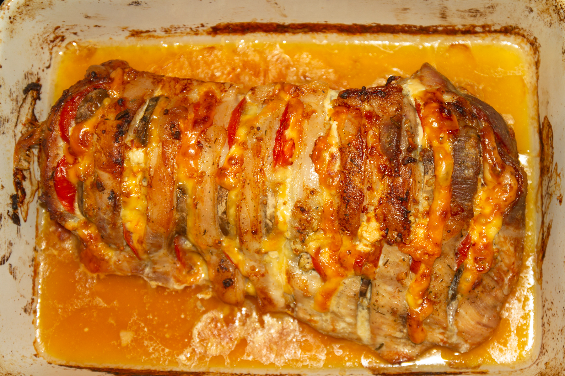 Чеснок очищаем и выдавливаем через пресс. Соединяем оливковое масло, горчицу, чеснок и перец. Перемешиваем. В мясе делаем надрезы, примерно на 2/3 в глубину, на расстоянии 1,5-2 см. Натираем мясо солью и получившимся маринадом. Оставляем минимум на 1 час. Промываем грибы и помидоры и нарезаем ломтиками. Сыр нарезаем тонкими пластинами. Включаем духовку для разогрева до 180 градусов. Фаршируем мясо помидорами, сыром и грибами. Перевязываем мясо нитью, чтобы «гармошка» не развалилась. Помещаем мясо в рукав для запекания и укладываем в форму или на противень. В рукаве делаем 2-3 отверстия. Отправляем мясо в духовку на 1 час. После 1 часа запекания разрезаем рукав. Отправляем мясо в духовку еще на 15-20 минут для зарумянивания.