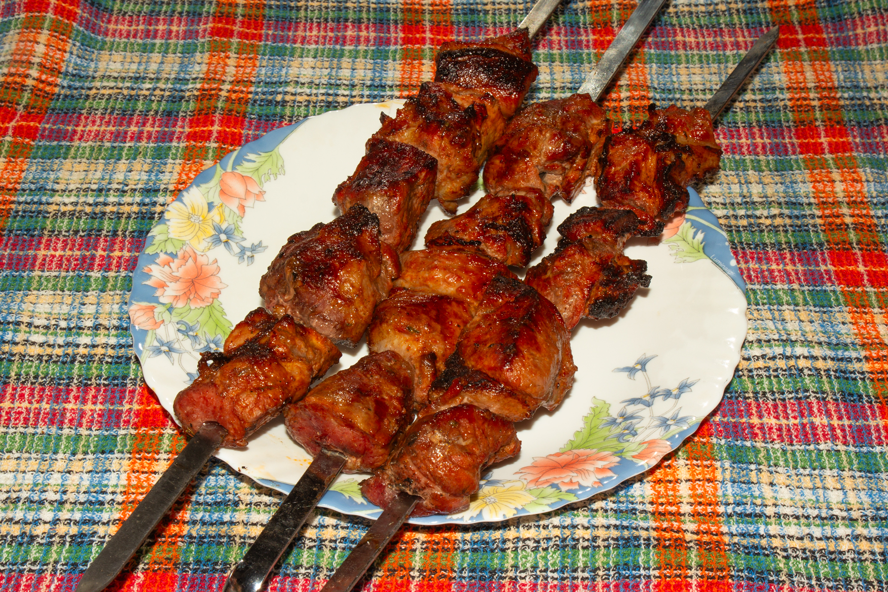 Мясо помойте и просушите бумажными полотенцами. Нарежьте средними кусочками. Очистите от шелухи лук. Порежьте его кольцами. Замаринуйте мясо. В глубокой миске смешайте мясо с луком, солью и специями. Добавьте томатную пасту и уксус. Хорошо перемешав и затянув миску пищевой пленкой, оставьте на 2 часа мариноваться. Пожарьте шашлык. Нанизывайте мясо на шампуры. Шампуры поместите на мангал над горячими углями без открытого огня. Не забывайте время от времени переворачивать, чтобы мясо пропеклось равномерно.