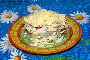 Печень порезать кусочками, обжарить в сливочном масле с луком. Телятину, порезав на кусочки, тоже обжарить на сливочном масле до появления румяной корочки. Когда мясо зарумянится, выпустить на него сырые яйца и дать им затвердеть. Жареную печень, телятину и отварные шампиньоны пропустить через мясорубку. Добавить специи (молотый перец, уцхо-сунели и т. д.), соль и хорошо вымешать. В глубокую посуду положить слоями: печеночную смесь, рубленную курицу и т.д. Залить растопленным сливочным маслом, положить в холодильник и оставить на 12 часов. Затем вынуть из формы, украсить зеленью и майонезом.