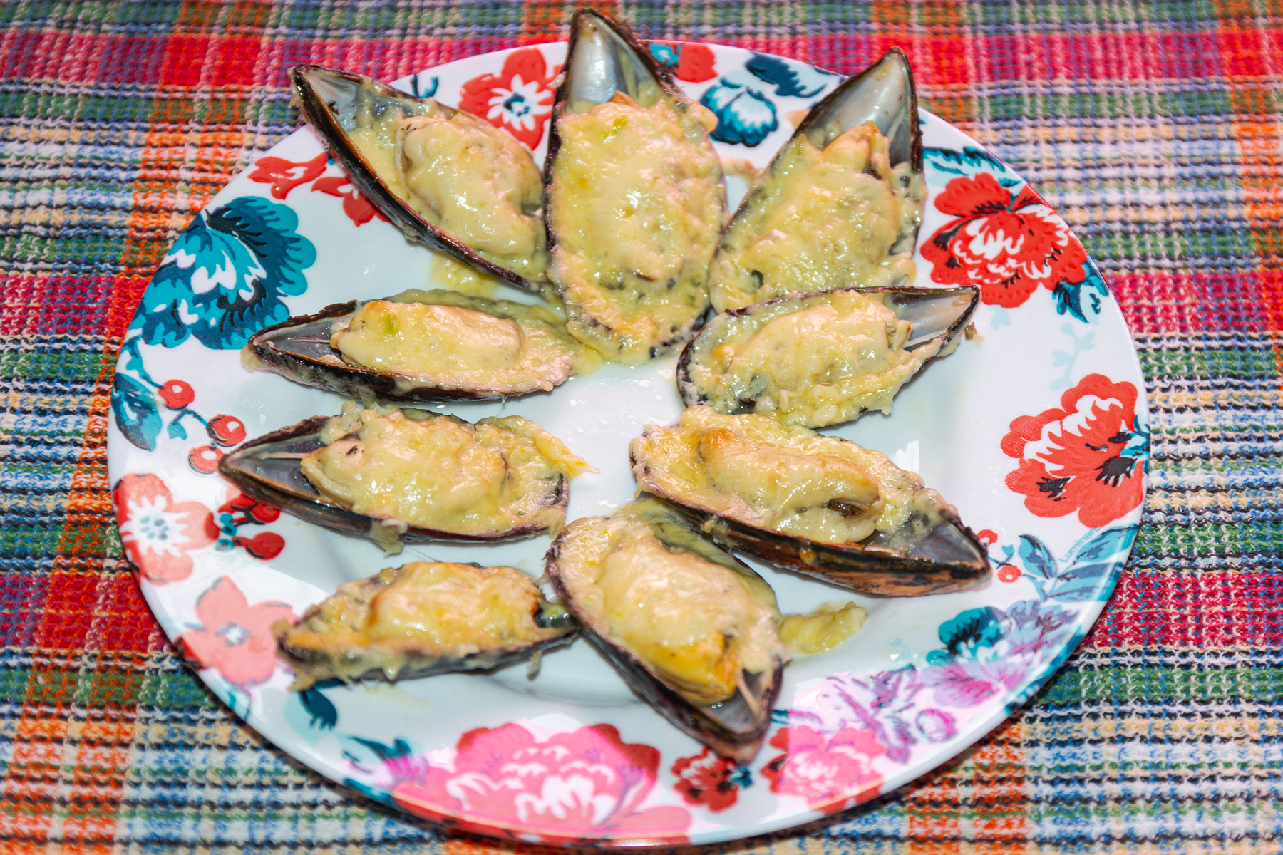 Выстелите форму для запекания фольгой и разложите на ней кругом раковины с очищенными мидиями. Промойте их и выложите ровным слоем на фольге, покройте сырной массой перед запеканием. Выложите в каждую раковину немного сырно-чесночной массы, стараясь не выронить ее на форму.