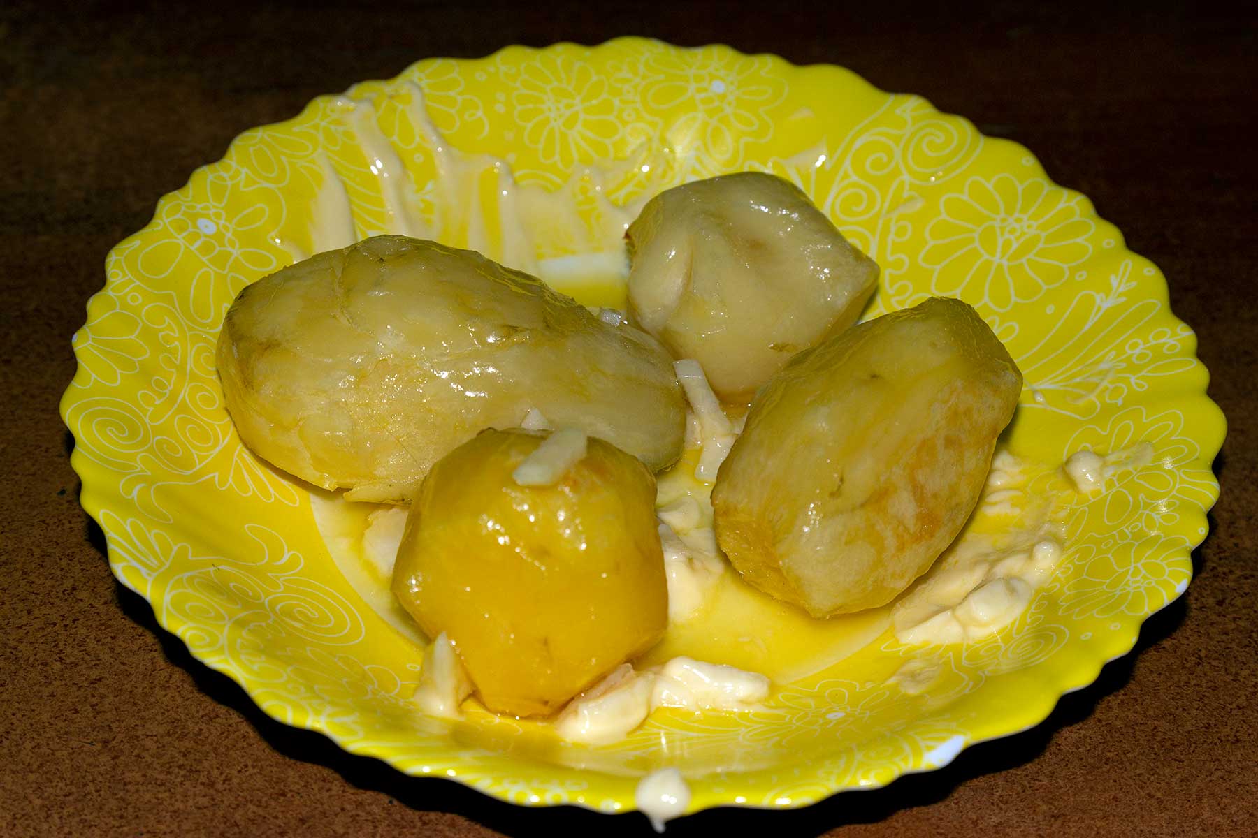 Картофель отварить. Выложить картофель на противень и поставить в духовку на 15-20 минут. Сливочное масло растопить, натереть туда чеснок и после этого выложить картофель из духовки и обвалять в масле с чесноком.