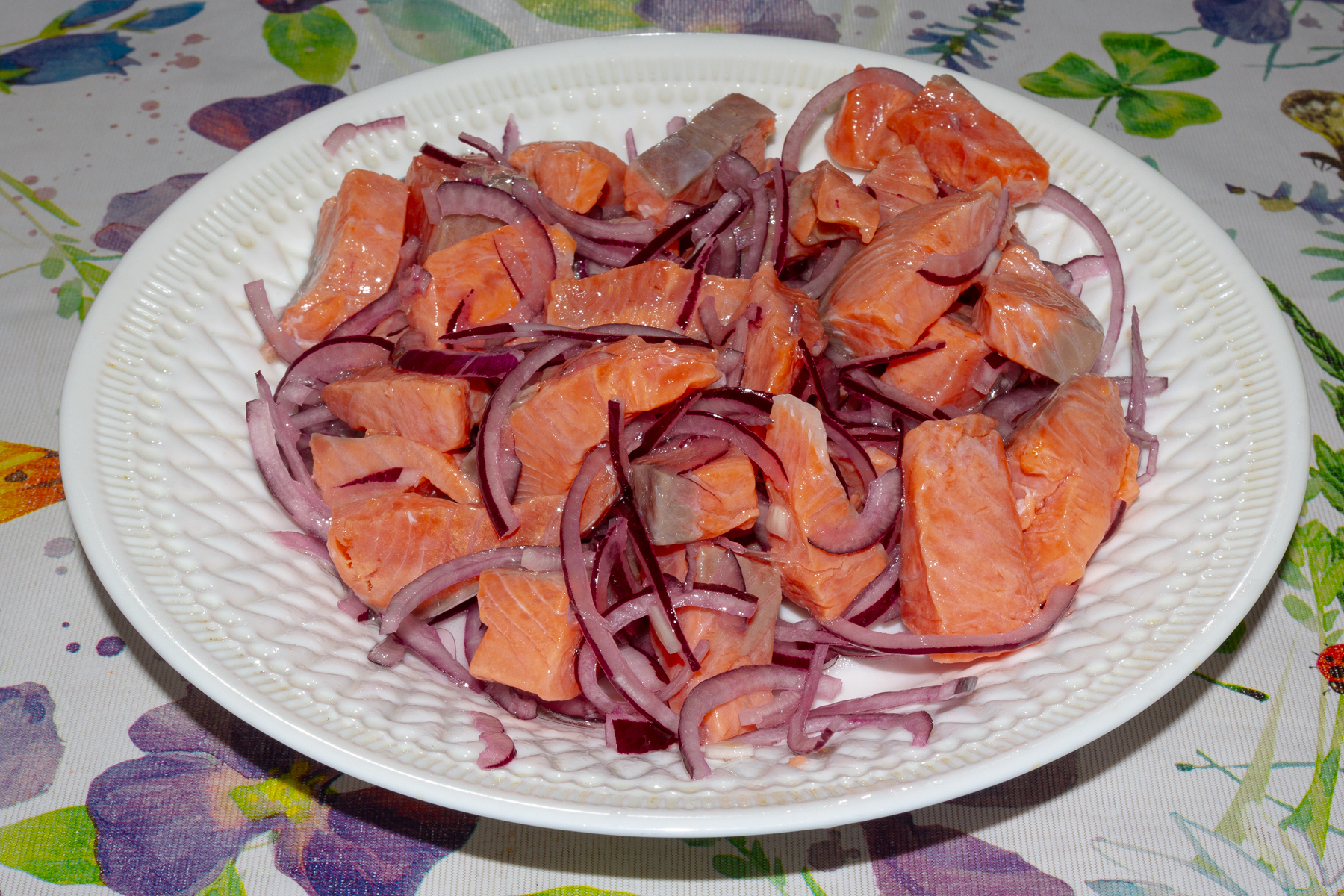 Чистим рыбу и аккуратно отделяем кожу. Убираем хребет и вынимаем все кости. Нарезаем филе на ломтики. Луковицы чистим и нарезаем полукольцами. Рыбу кладем в керамическую или стеклянную посуду, добавляем лук, специи, 3 столовых ложки соли и 2 столовых ложки сахара, 70-80 грамм подсолнечного масла. Теперь перемешиваем рыбу. Закрываем крышкой и оставляем минимум на 40 минут. Через 40 минут рыба будет готова.