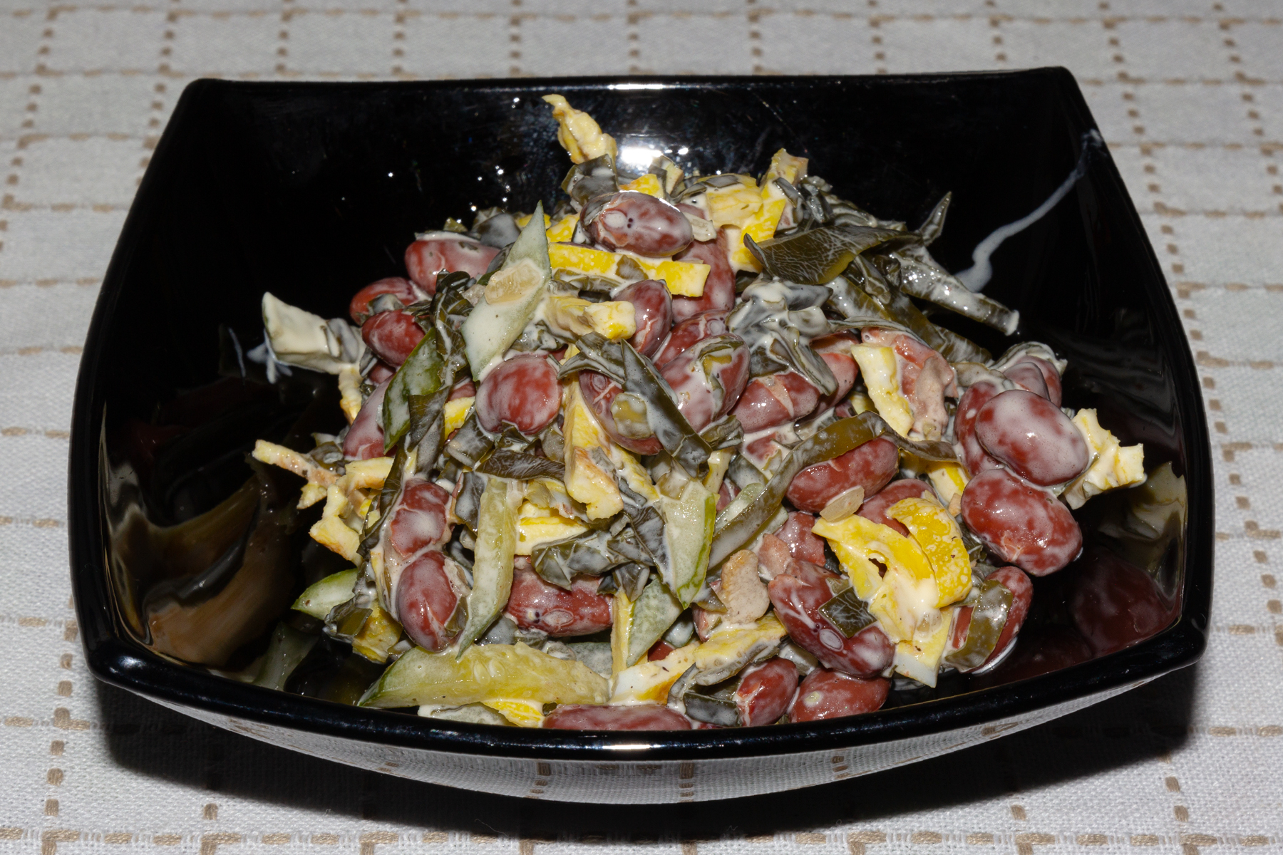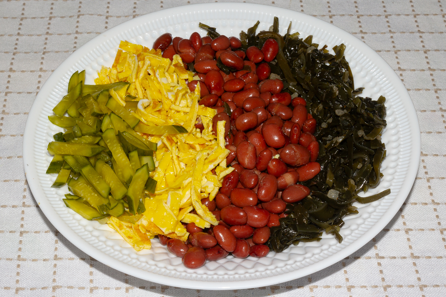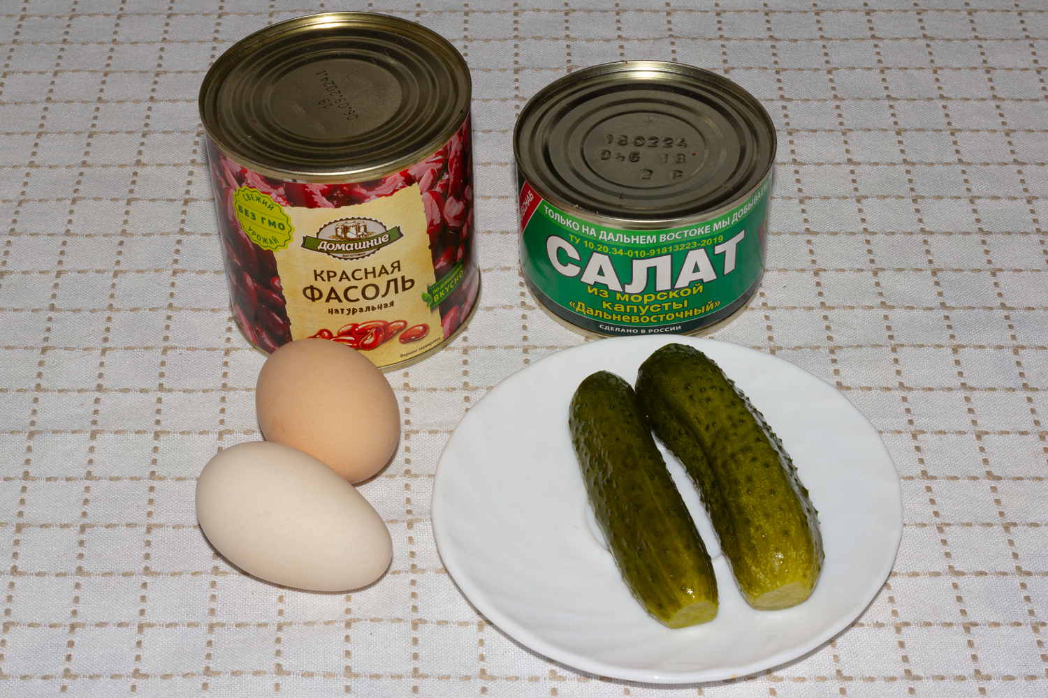 Фасоль откинуть на дуршлаг и промыть. Выложить в салатник. Яйца смешайте с солью и пожарьте яичный блин. Нарежьте и добавьте к фасоли. С капусты слить рассол и выложить в салатник. Огурец нарезать кубиками, чеснок натереть.